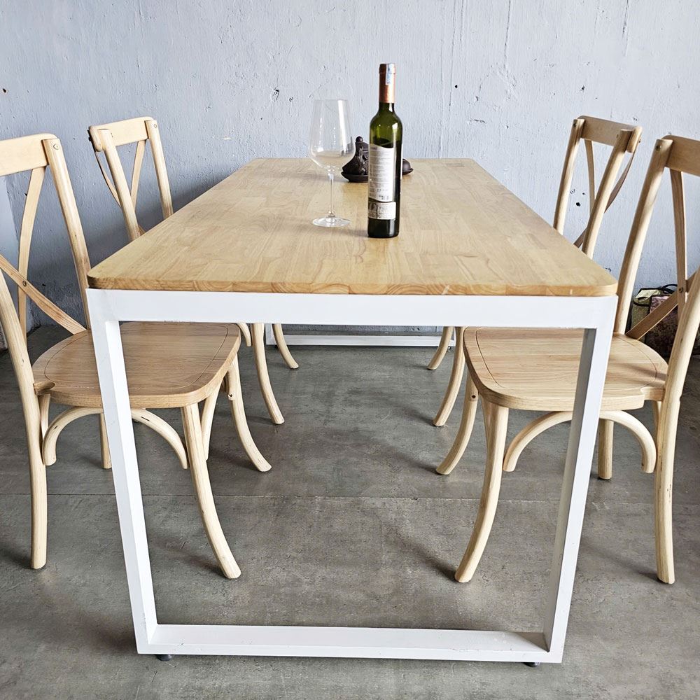 Khung chân bàn bằng sắt hộp 25x50mm, dày 1.2mm, được sơn tĩnh điện màu trắng, tạo nên sự tương phản thú vị với mặt gỗ ấm áp. Độ dày 1.2mm của sắt hộp không chỉ đảm bảo độ chắc chắn cho khung chân mà còn giữ được nét thanh mảnh, hiện đại. Lớp sơn tĩnh điện không chỉ mang đến vẻ đẹp hoàn thiện mà còn bảo vệ khung sắt khỏi gỉ sét và trầy xước, giúp kéo dài tuổi thọ của sản phẩm. Hệ chân Rectang, với cấu trúc hình chữ nhật vững chắc, mang đến sự ổn định tuyệt đối cho bàn ăn, đồng thời tạo nên vẻ ngoài phóng khoáng, hiện đại.