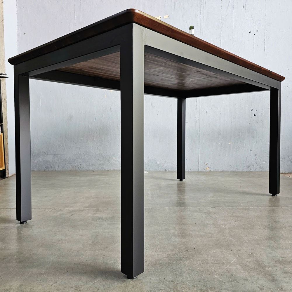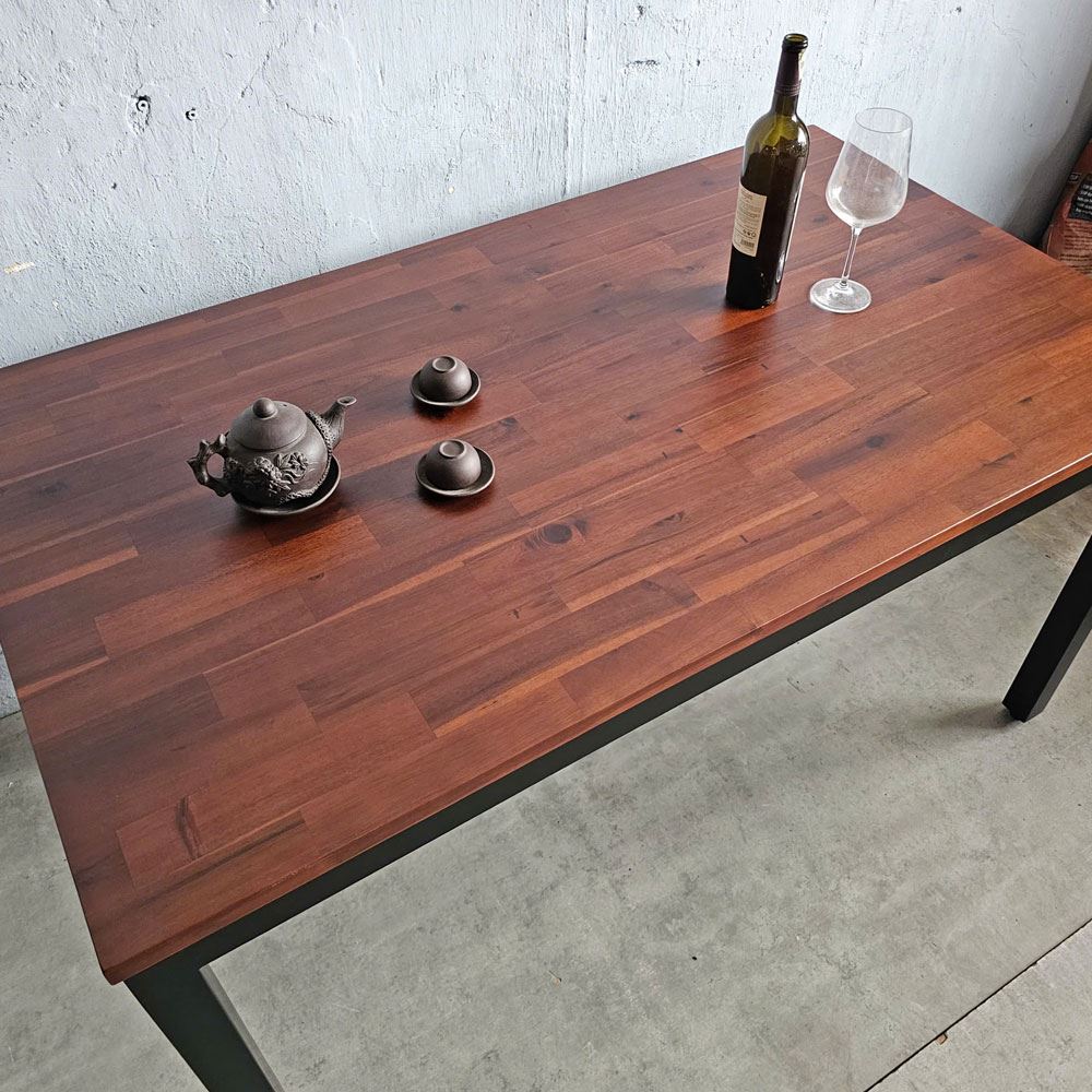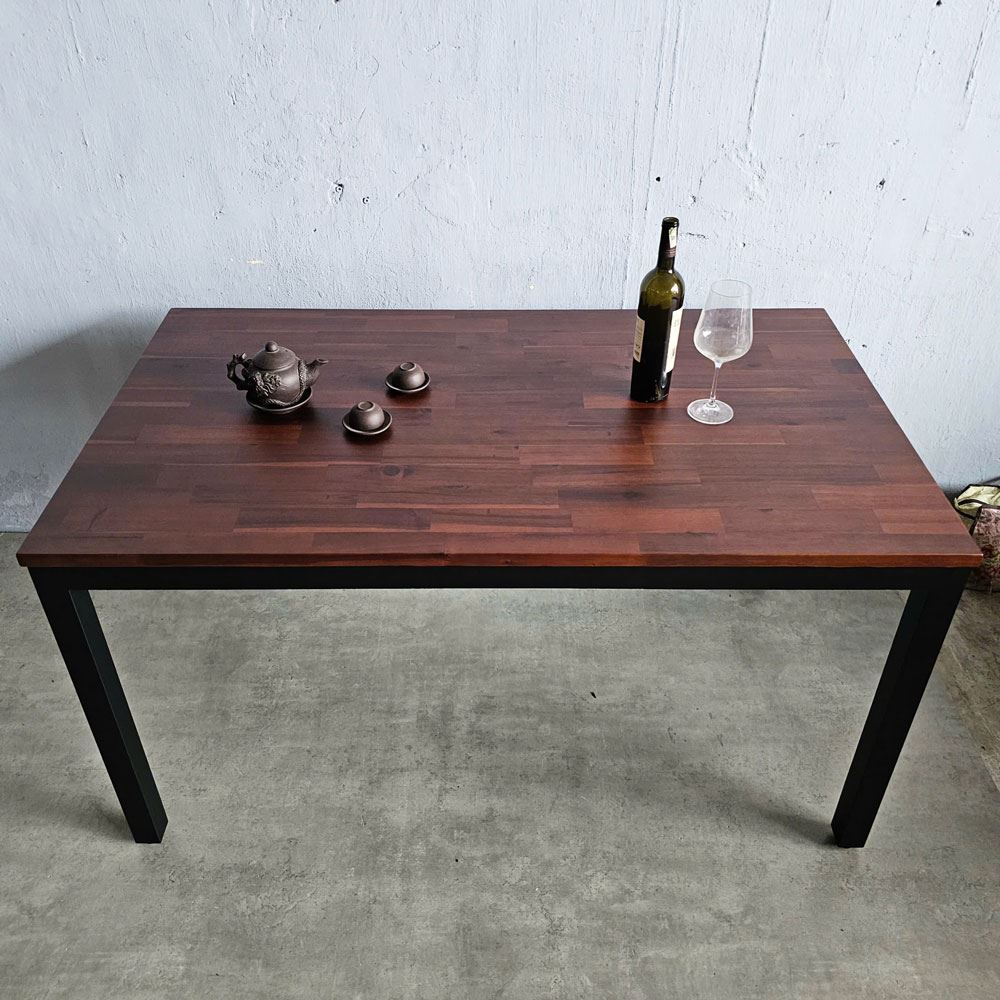 Bề mặt gỗ được HomeOffice chà nhám mịn màng và phủ một lớp sơn PU chống thấm nước, không chỉ bảo vệ gỗ khỏi tác động của môi trường mà còn tạo nên một bề mặt sáng bóng, dễ dàng vệ sinh. Bạn có thể thoải mái thưởng thức những bữa ăn ngon mà không lo về vết bẩn. Khung chân sắt hộp cứng cáp, dày 1.2mm, được sơn tĩnh điện, vừa đảm bảo tính thẩm mỹ vừa tăng cường khả năng chịu lực. Thiết kế chân bàn đơn giản, tinh tế, tạo nên sự cân bằng hài hòa với mặt bàn gỗ.