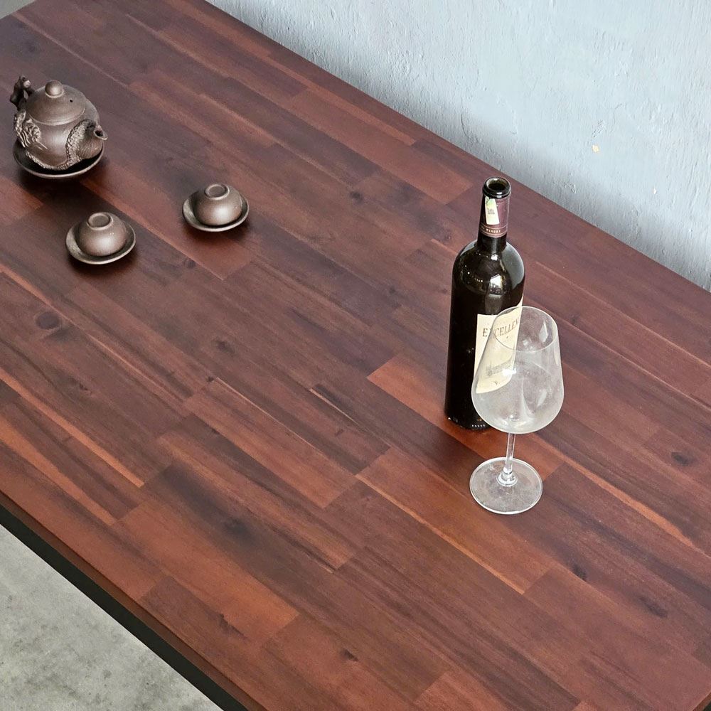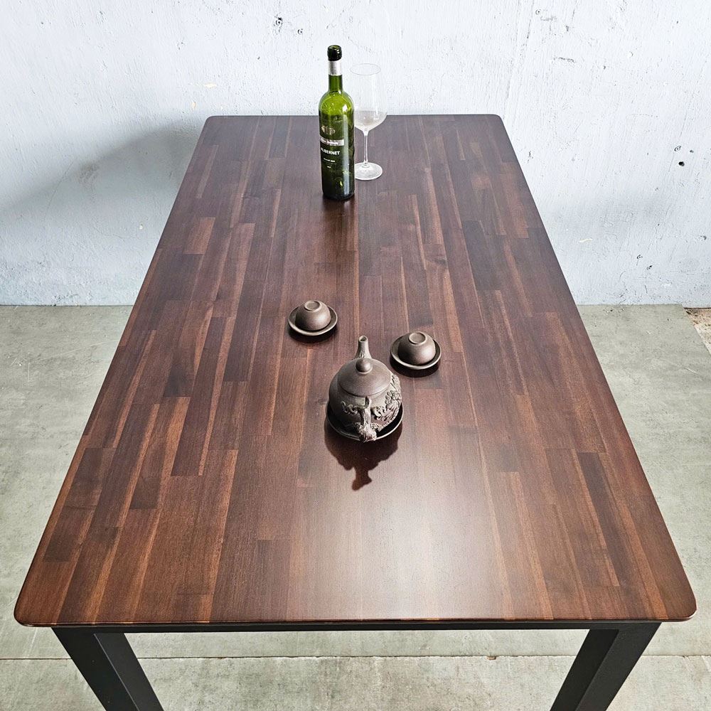 Mặt bàn gỗ dày 25mm được chà nhám mịn màng và phủ một lớp chống thấm, không chỉ đảm bảo độ bền mà còn tôn lên vẻ đẹp tự nhiên của gỗ