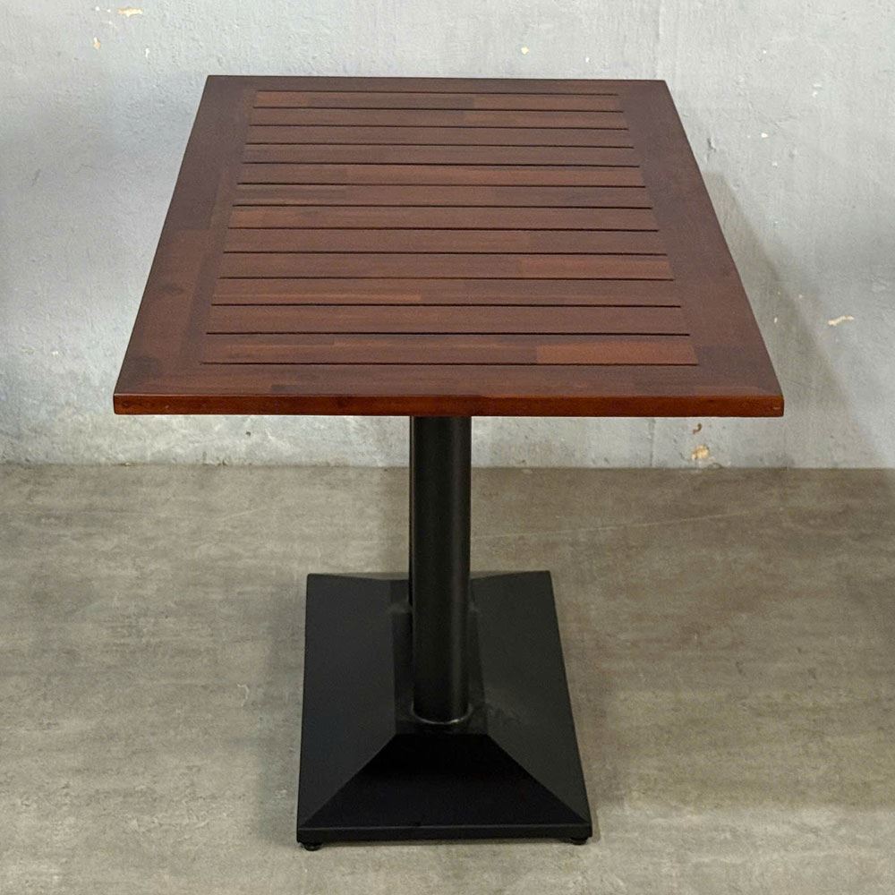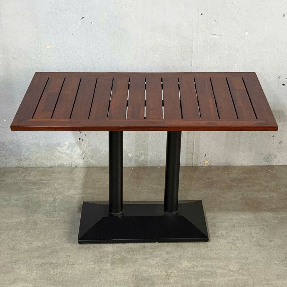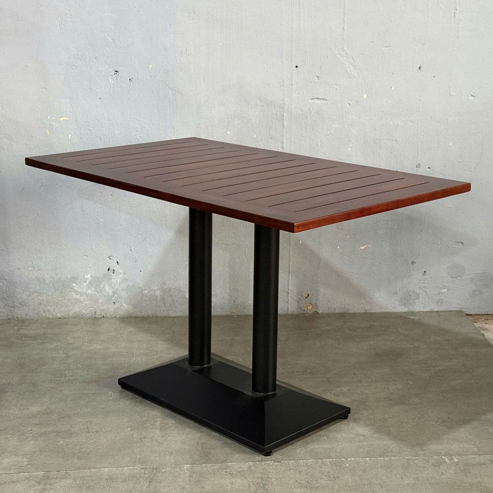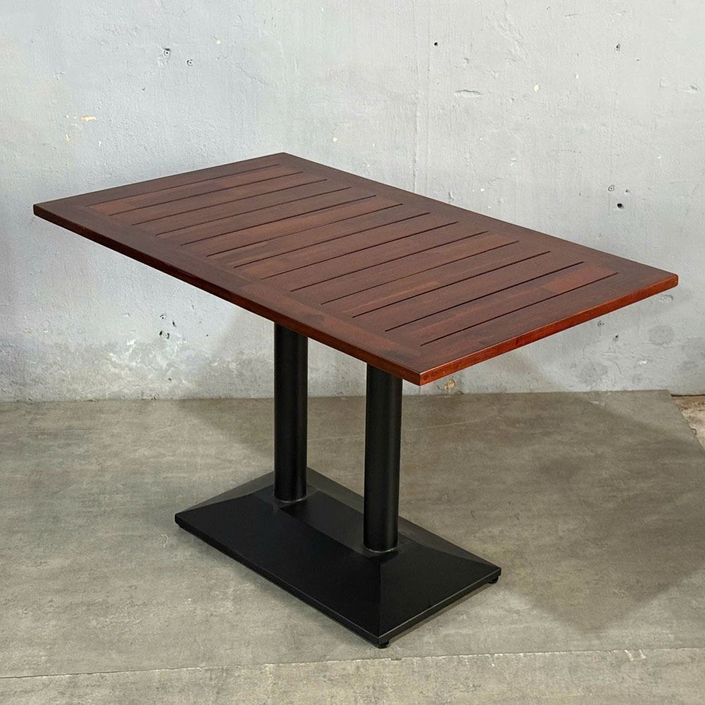 Khung chân sắt với hai trụ tròn vững chãi không chỉ đảm bảo độ ổn định tuyệt vời cho chiếc bàn mà còn mang đến một vẻ đẹp thanh lịch và hiện đại. Lớp sơn tĩnh điện màu đen không chỉ bảo vệ khung chân khỏi sự ăn mòn của thời tiết mà còn tạo nên một sự tương phản mạnh mẽ với màu sắc ấm áp của mặt bàn gỗ, tạo nên một tổng thể hài hòa và bắt mắt. Đế chân được thiết kế hình học (Geometric) với những đường nét mạnh mẽ, dứt khoát, thể hiện sự vững chãi và sang trọng.