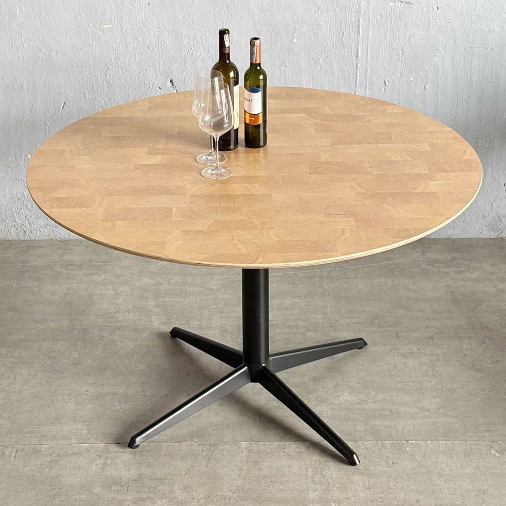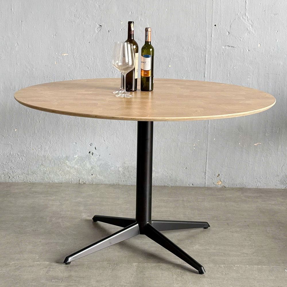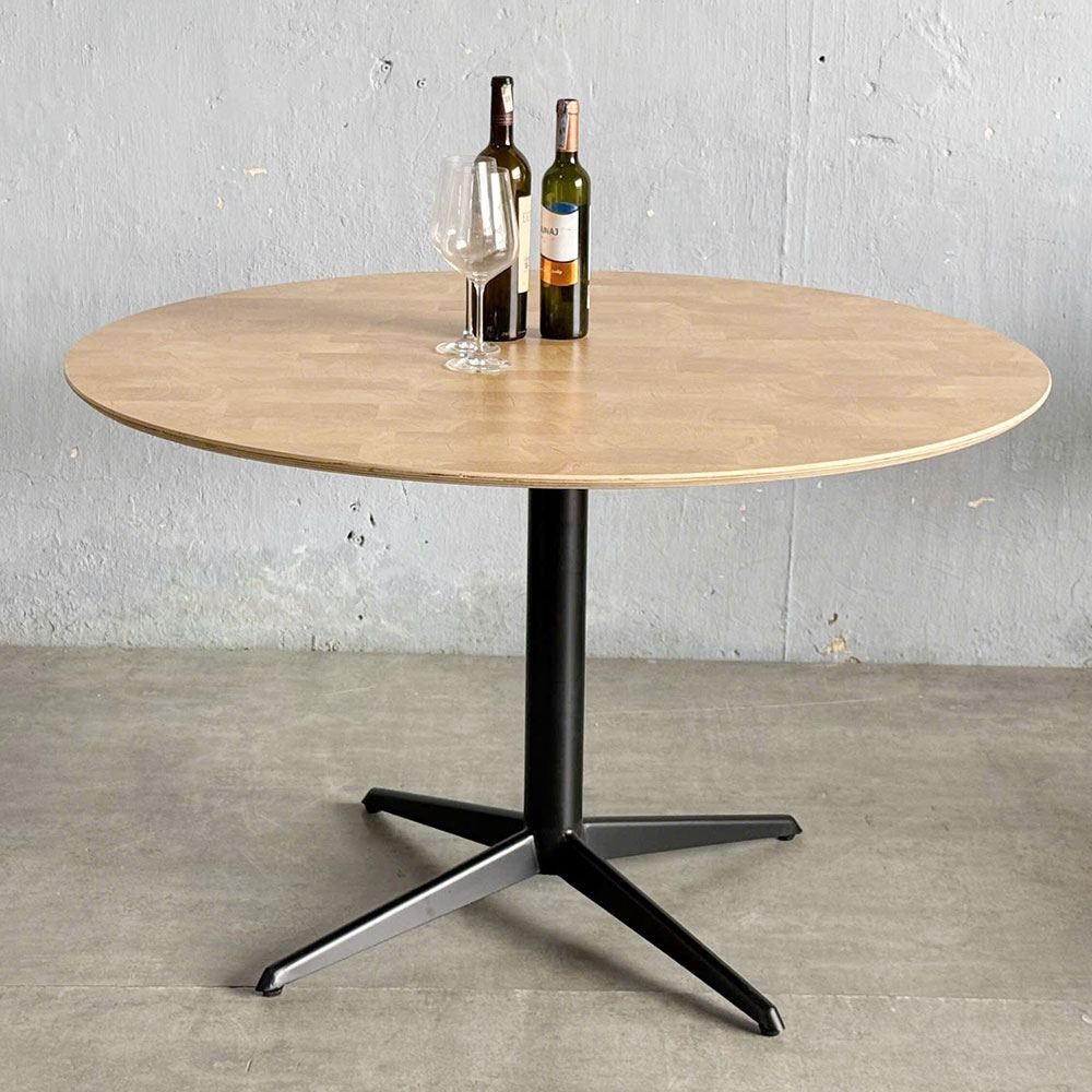 Bàn ăn tròn 120cm gỗ Plywood vân Cut Trunk chân sắt một trụ - BA68214 với đường kính mặt bàn 120cm được làm bằng gỗ Plywood phủ Melamin dày 18mm chống nước tuyệt đối, HomeOffice sơn lộ cạnh chứ không gián cạnh, cốt gỗ plywood siêu bền không sợ nước nên có thể an tâm lau dọn dễ dàng. Chân sắt có thiết kế hình chữ X mang lại cảm giác hiện đại, trẻ trung cho bàn ăn.