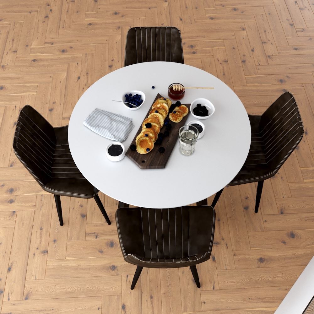 Bàn ăn tròn sở hữu kiểu dáng nhẹ nhàng, thanh thoát, góp phần tạo nên bầu không khí ấm cúng, gần gũi cho những bữa ăn gia đình. Thiết kế này cũng giúp tiết kiệm diện tích, phù hợp với nhiều không gian bếp từ rộng rãi đến khiêm tốn.