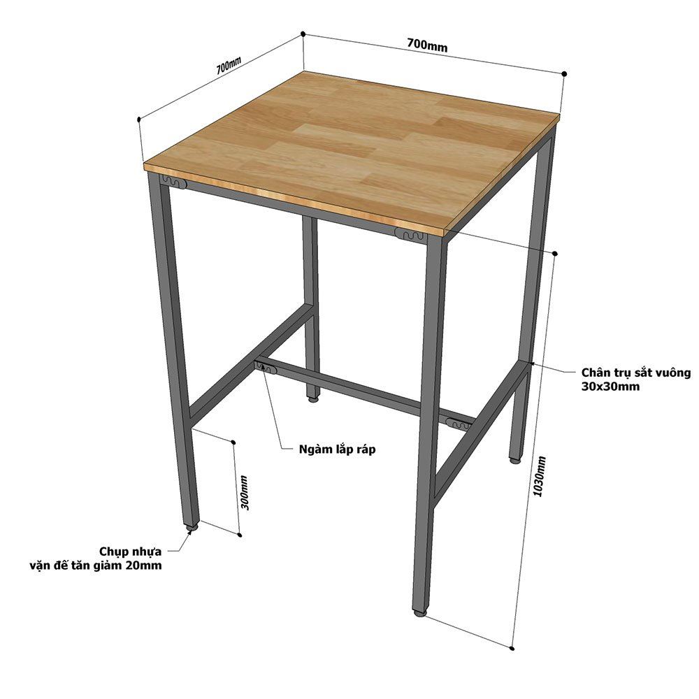 Bàn bar vuông 70cm BB002 với mặt bàn là gỗ cao su tiêu chuẩn AA dày 17mm, được xử lý chống thấm nước, cong vênh đảm giúp bạn dễ dàng vệ sinh lau chùi. Kết hơp mặt bàn gỗ là khung chân sắt cơ cấu lắp ráp, bề mặt phủ sơn tĩnh điện chống rỉ sét, đảm bảo độ bền cao. Bàn bar BB002 sở hữu kiểu dáng đơn giản, chiều cao 105cm phù hợp với các mẫu ghế bar hiện nay.