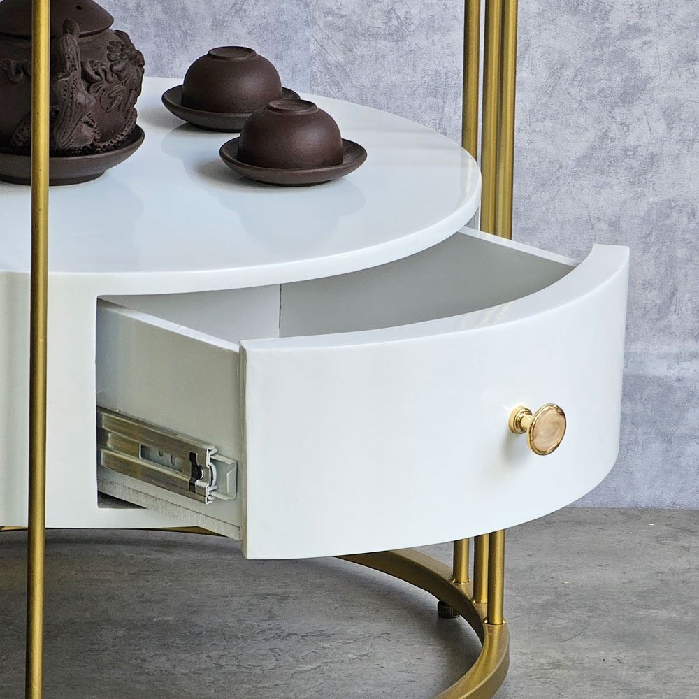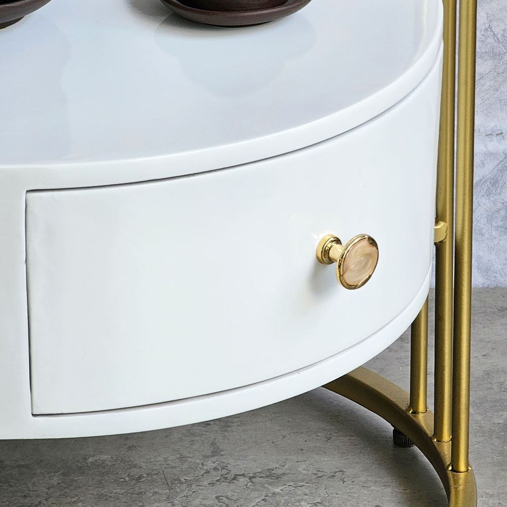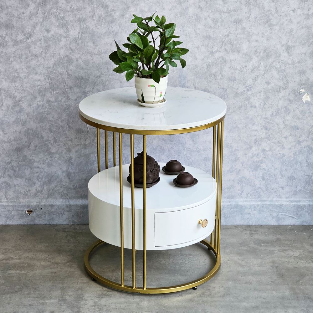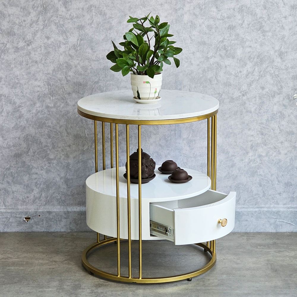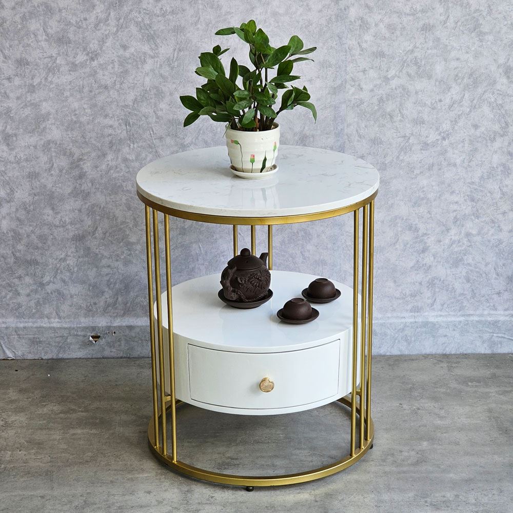 Bàn bên sofa, tab trang trí 2 tầng có hộc tủ SST016 với thiết kế 2 tầng mặt trên là đá vân mây trắng và bên dưới là hộc tủ gỗ tiện lợi giúp tăng không gian sử dụng và lưu trữ.Phần khung sắt chắc chắn, bề mắt sắt phủ lớp sơn màu vàng đồng kết hợp với màu trắng của mặt đá và tủ gỗ toát lên vẻ tinh tế và sang trọng. Kích thước nhỏ gọn, dễ dàng di chuyển có thể được sử dụng như là bàn sofa nhỏ, đặt cạnh sofa hay tab trang trí phòng khách hoặc có thể sử dụng như là món đồ trang trí tạo điểm nhấn cho không gian phòng ngủ.