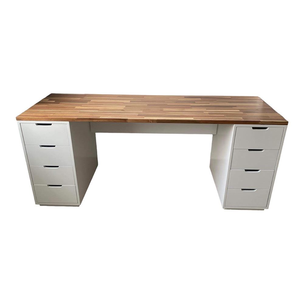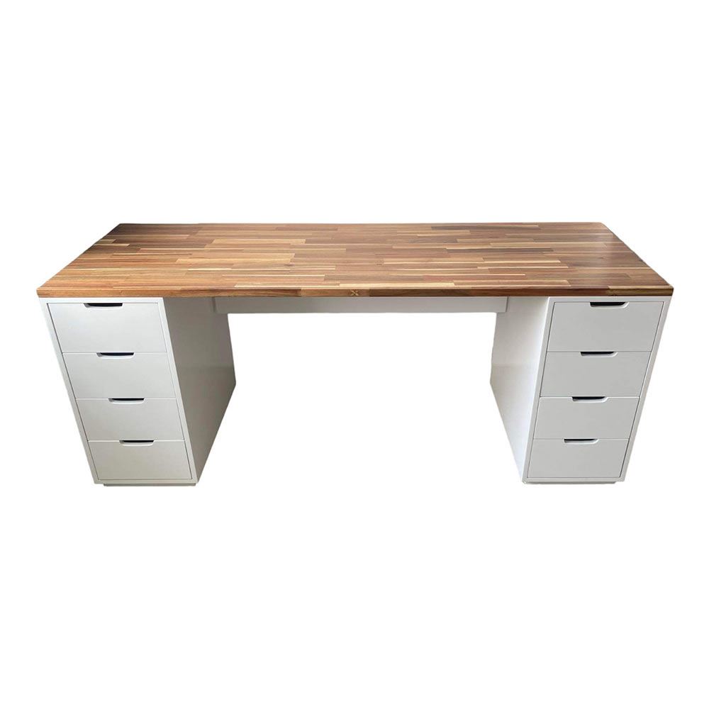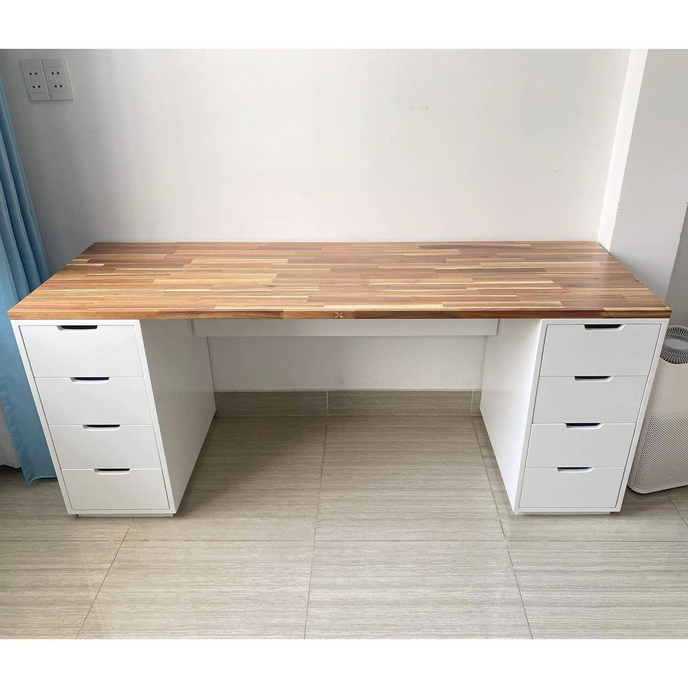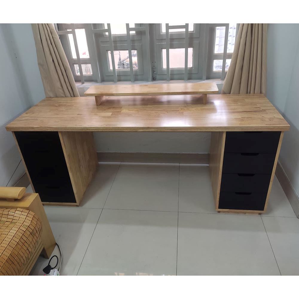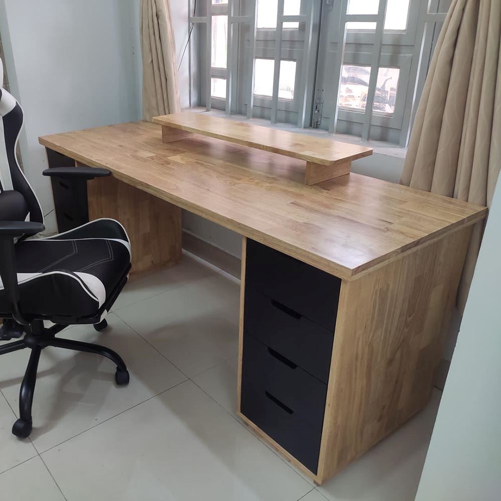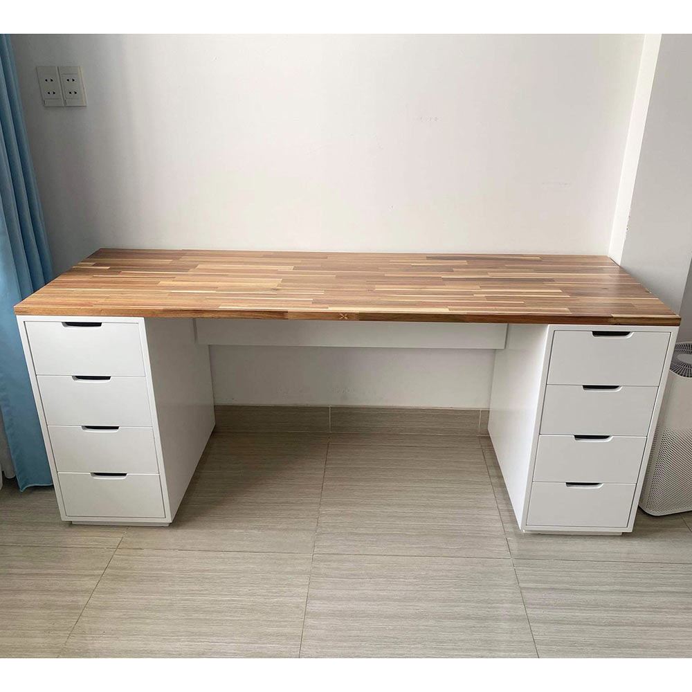 Mặt bàn gỗ tràm tại HomeOffice là loại dày 25mm tiêu chuẩn AA được xử lý PU hoàn thiện cho bề mặt sản phẩm rất đẹp mắt, chống nước tuyệt đối. Chân tủ được làm từ gỗ cao su tự nhiên tiêu chuẩn AA sơn PU hạn chế trầy xước tối đa.