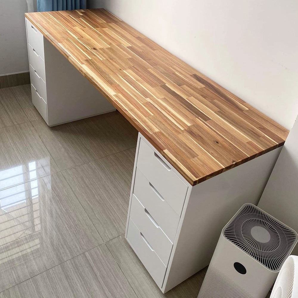 Mặt bàn GỖ TRÀM dày 25mm màu gỗ rất đẹp mắt, chống nước tuyệt đối.