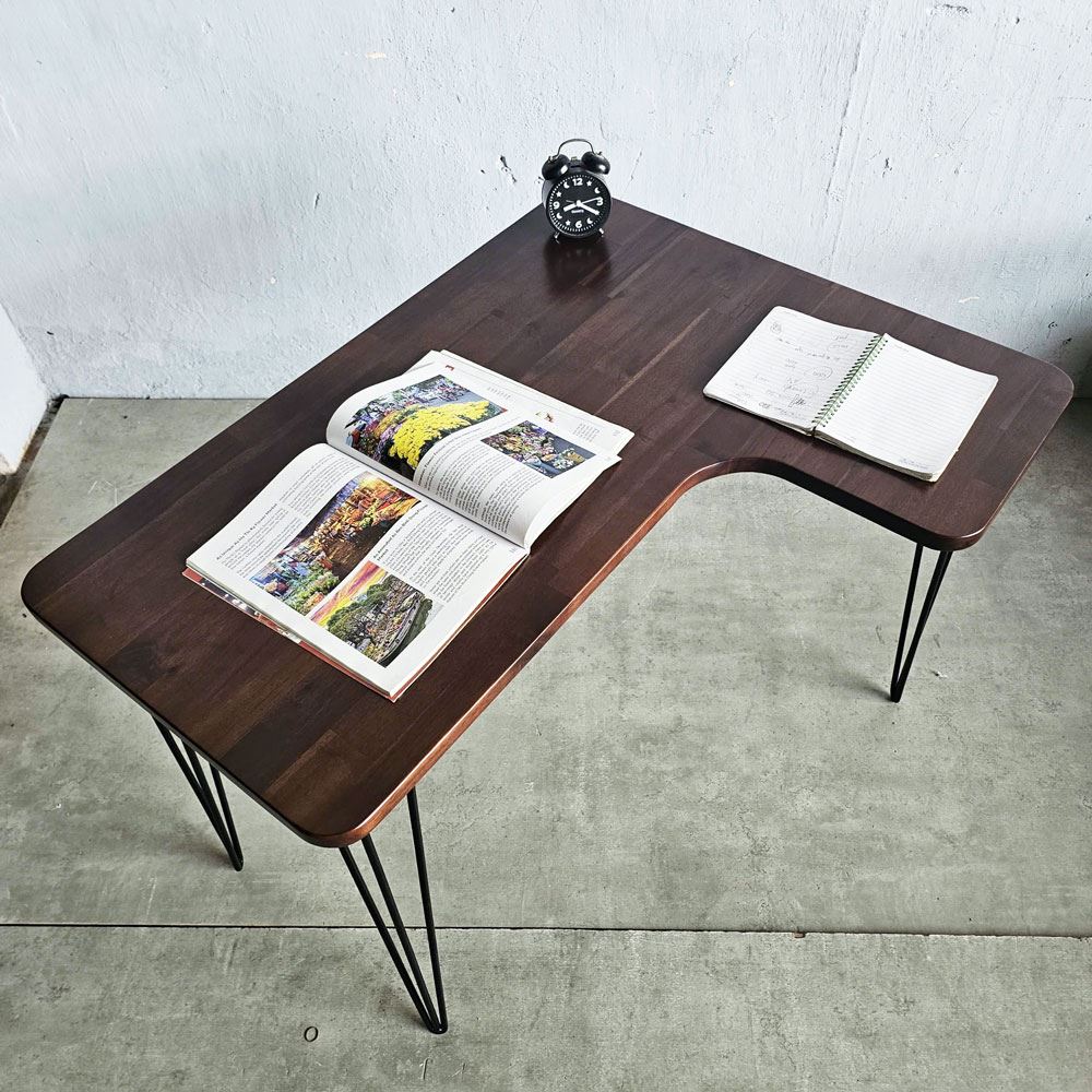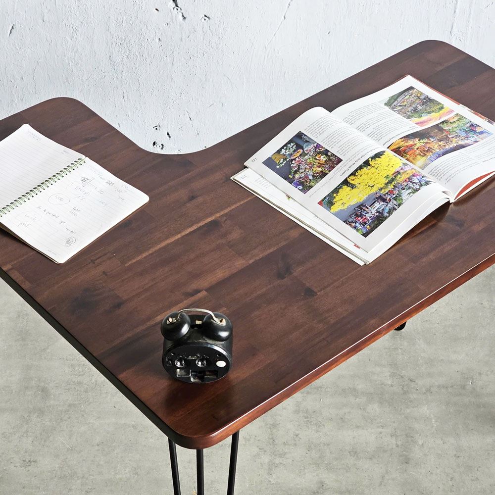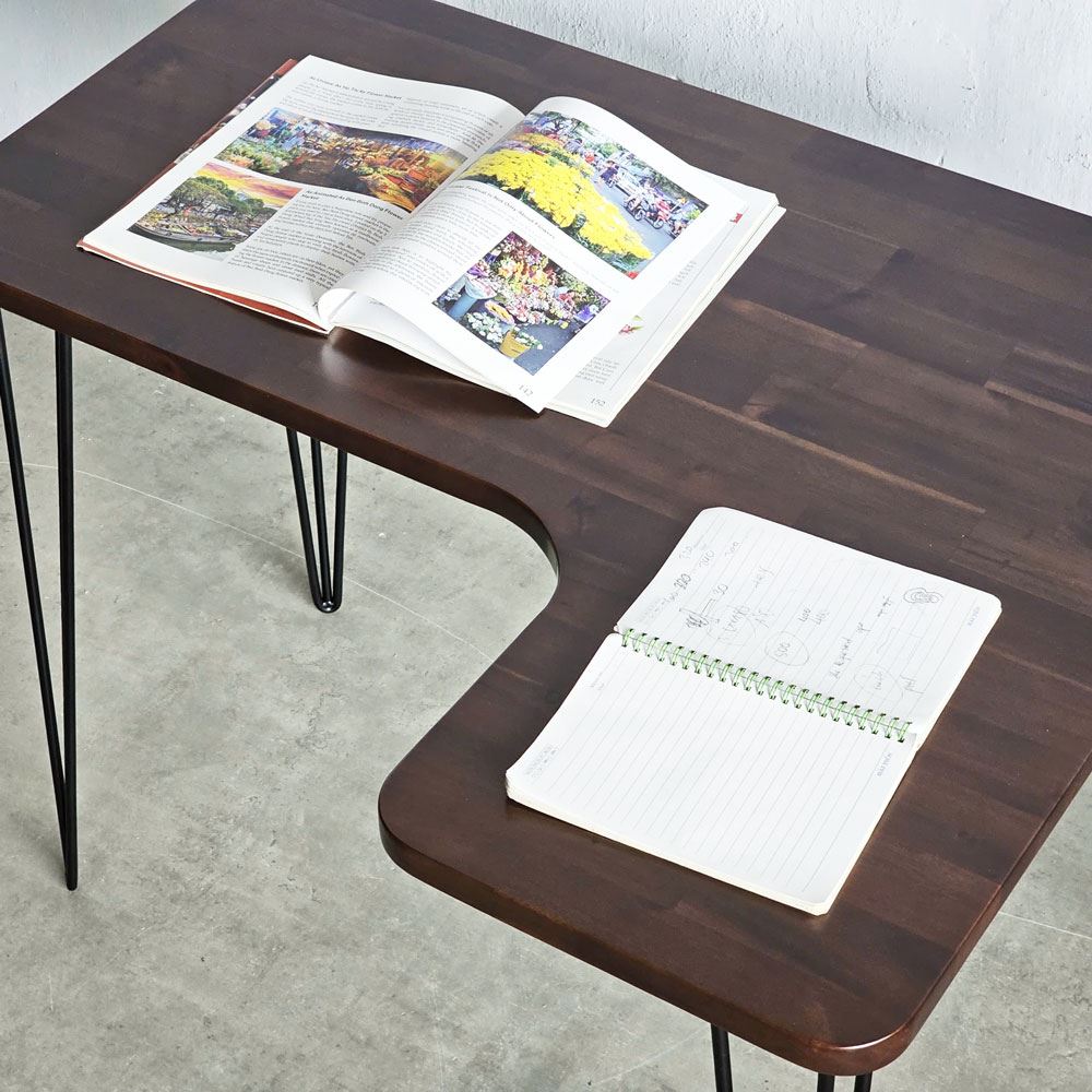 Mặt bàn hình chữ L được cắt từ một tấm gỗ liền mạch, mang đến vẻ đẹp tự nhiên và sang trọng