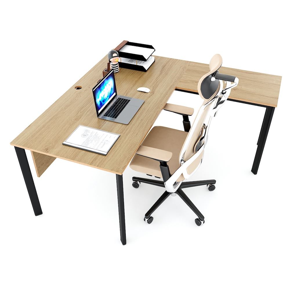Bàn làm việc chữ L mặt gỗ Plywood vân sồi chân sắt Oval lắp ráp