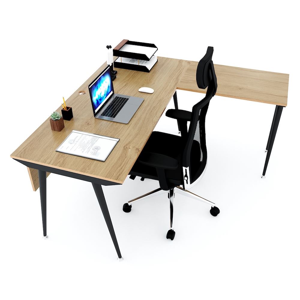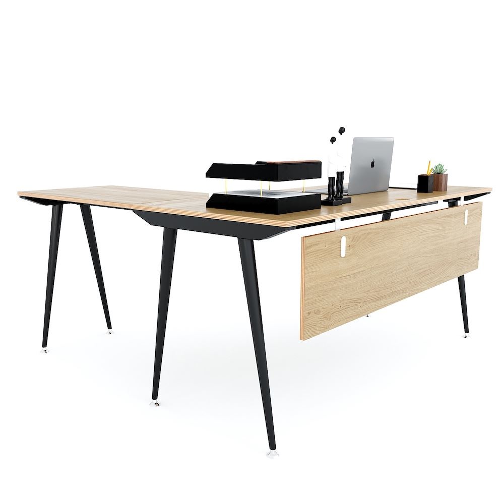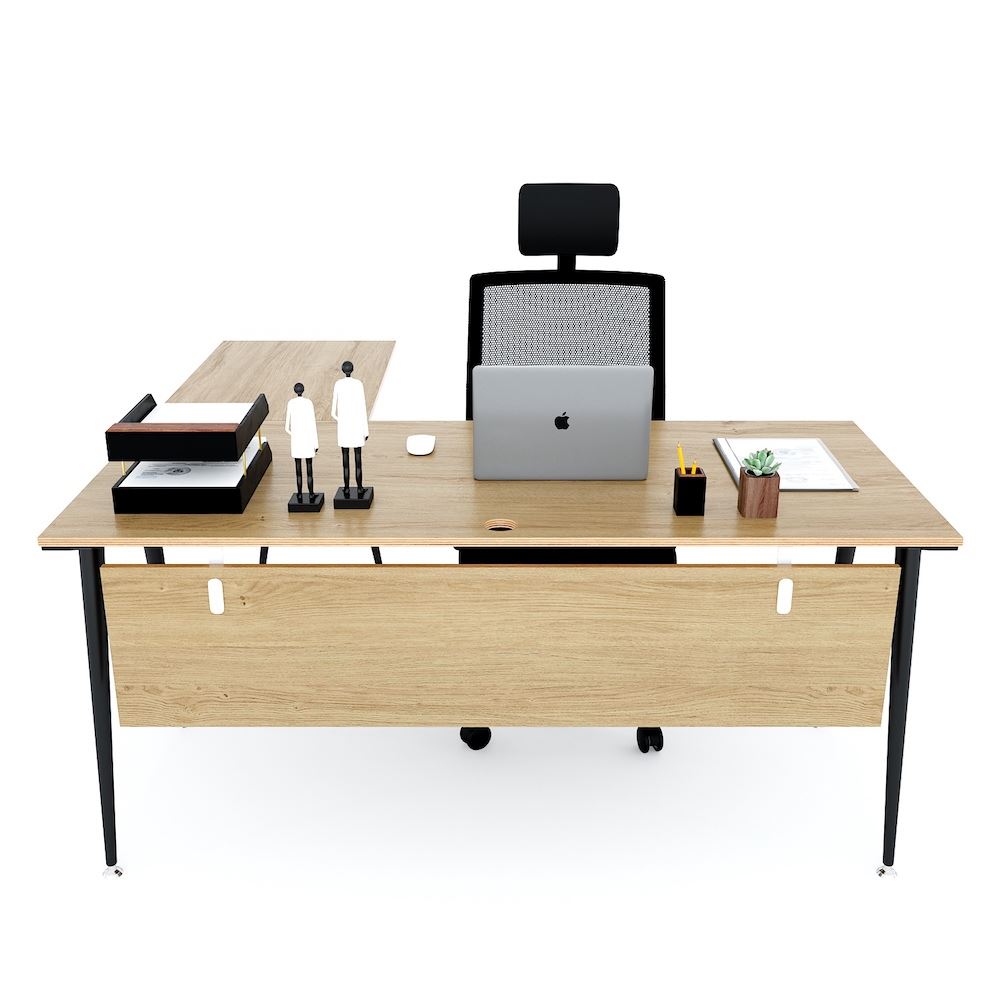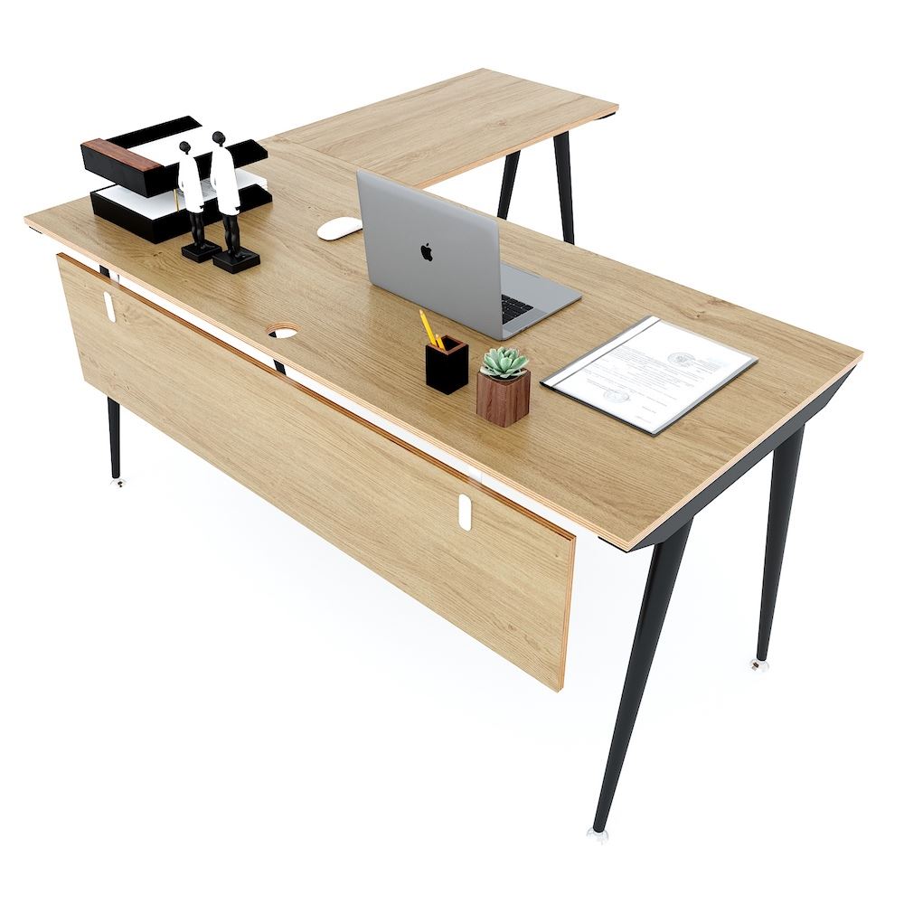 Bàn giám đốc chữ L gỗ Plywood phủ melamin chân sắt CONE HBCO039 với mặt bàn gỗ Plywood cốt gỗ tự nhiên bề mặt phủ melamin vân sồi đẹp mắt, bề mặt bàn được xử lý chống thấm nước và cong vênh, màu gỗ tự nhiên đẹp mắt mang đến sự thân thiện, gần gũi cho không gian làm việc của bạn. Kết hợp mặt bàn gỗ Plywood là hệ khung chân hệ Cone (sắt vuốt côn 49mm - 21mm) cơ cấu lắp ráp ngàm vô cùng chắc chắn và dễ dàng tháo lắp di dời, chân sắt sơn tĩnh điện chất lượng cao bền bỉ theo thời gian.