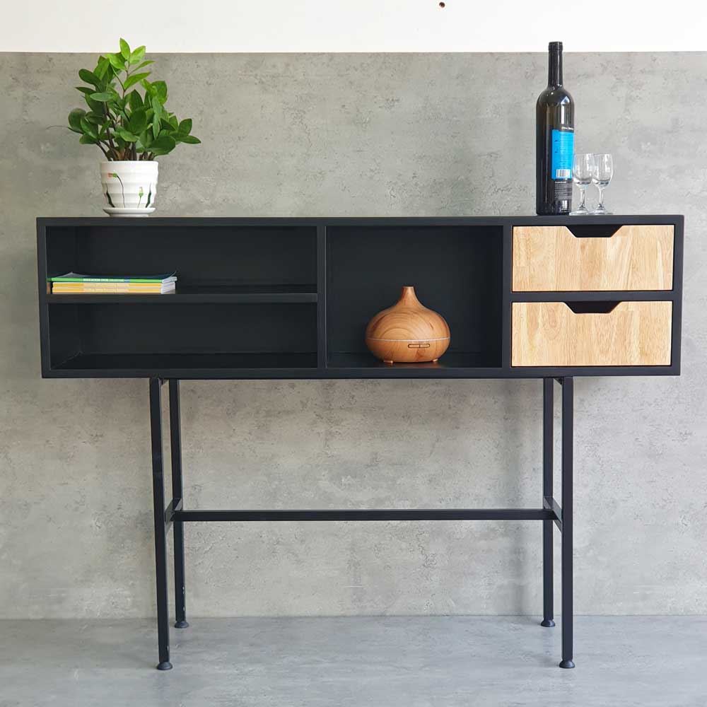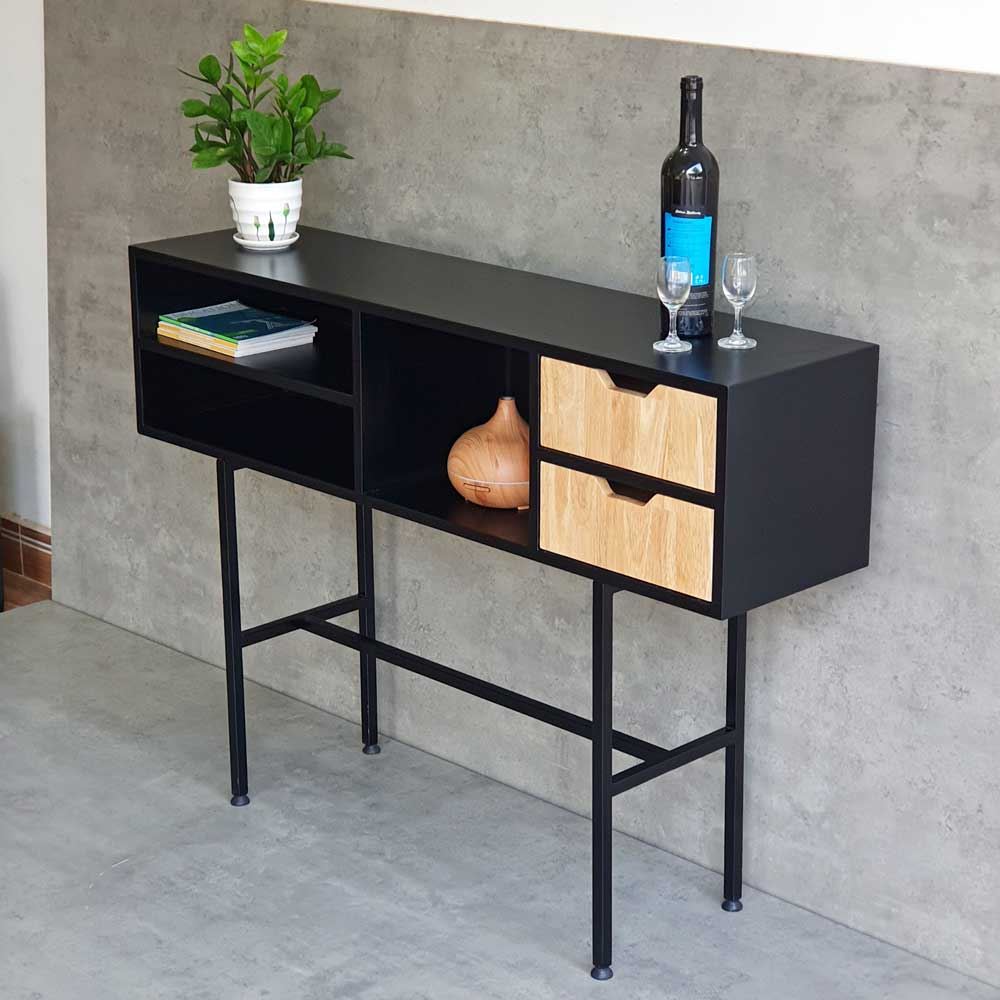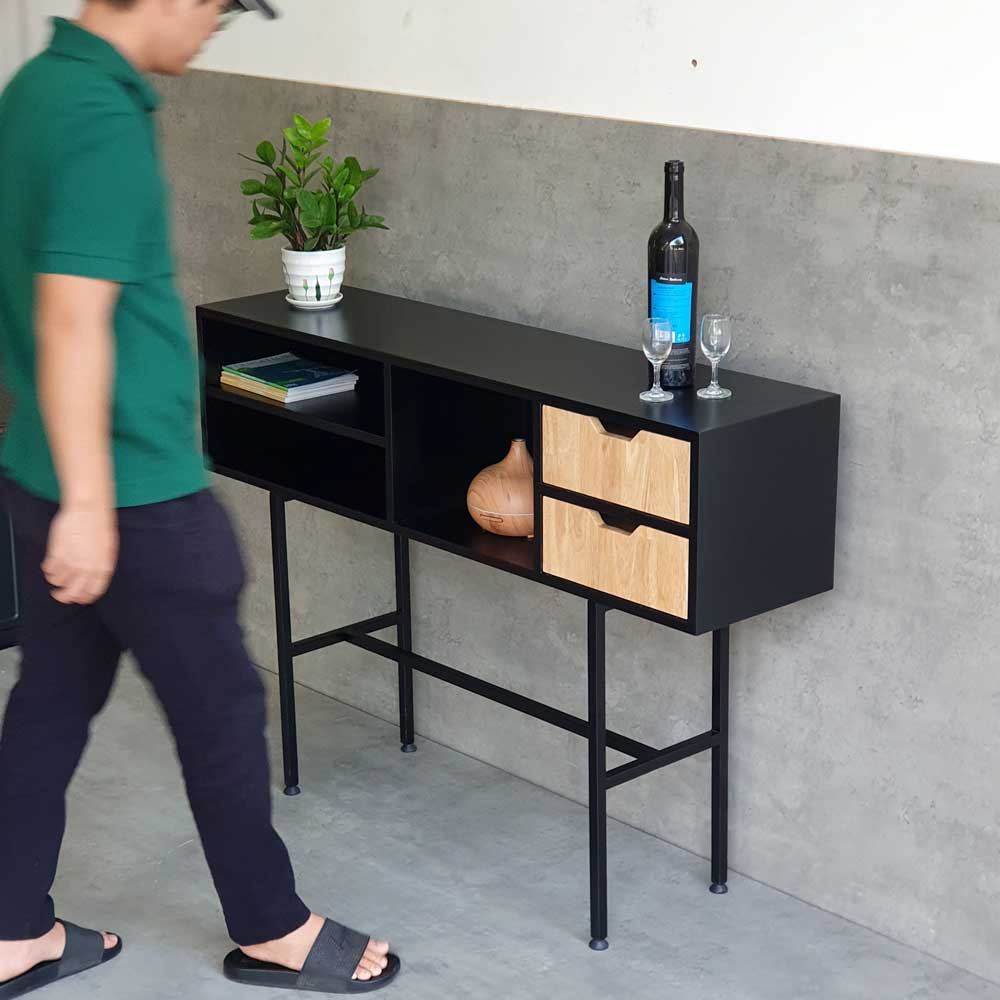 Bàn console CST060 sở hữu kiểu dáng hiện đại với phần mặt gỗ cao su sơn đen, kết hợp khung sắt sắt vuông 20x20mm mang đến sự chắc chắn, cứng cáp cho sản phẩm. Bàn được bố trí thêm 2 hộc kéo giúp bạn tăng không gian trưng bày và lưu trữ các món đồ yêu thích một cách dễ dàng. Gỗ cao su tự nhiên AA, độ dày 17cm, đạt tiêu chuẩn xuất khẩu, vân gỗ đẹp mắt, hoặc bạn có thể yêu cầu màu sắc theo bảng màu HomeOffice.