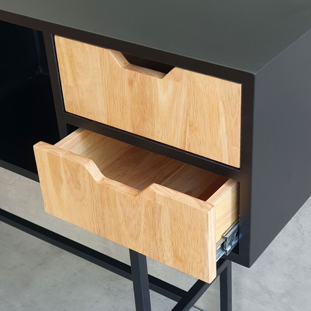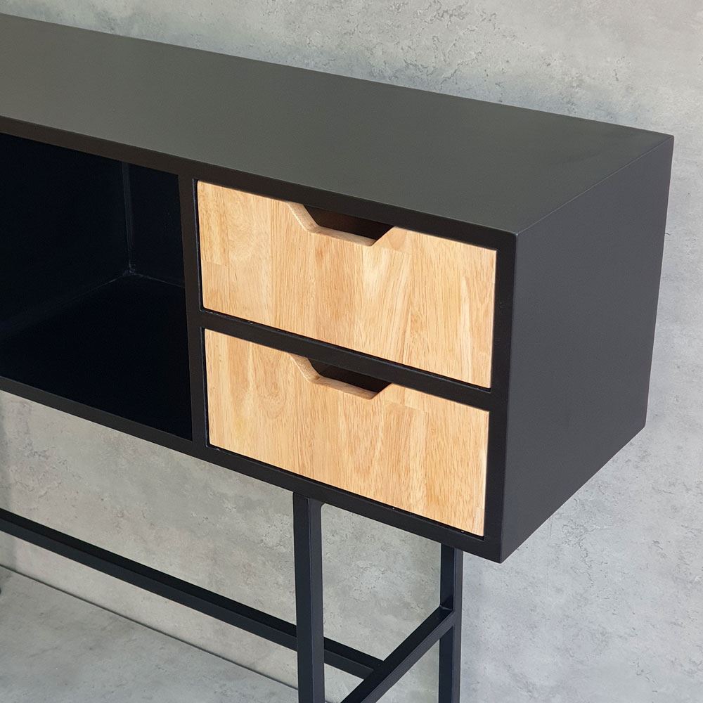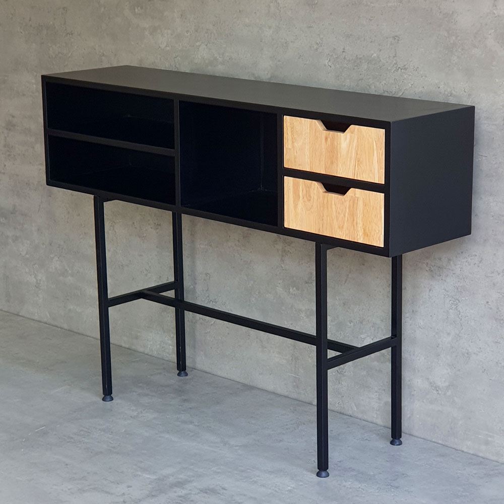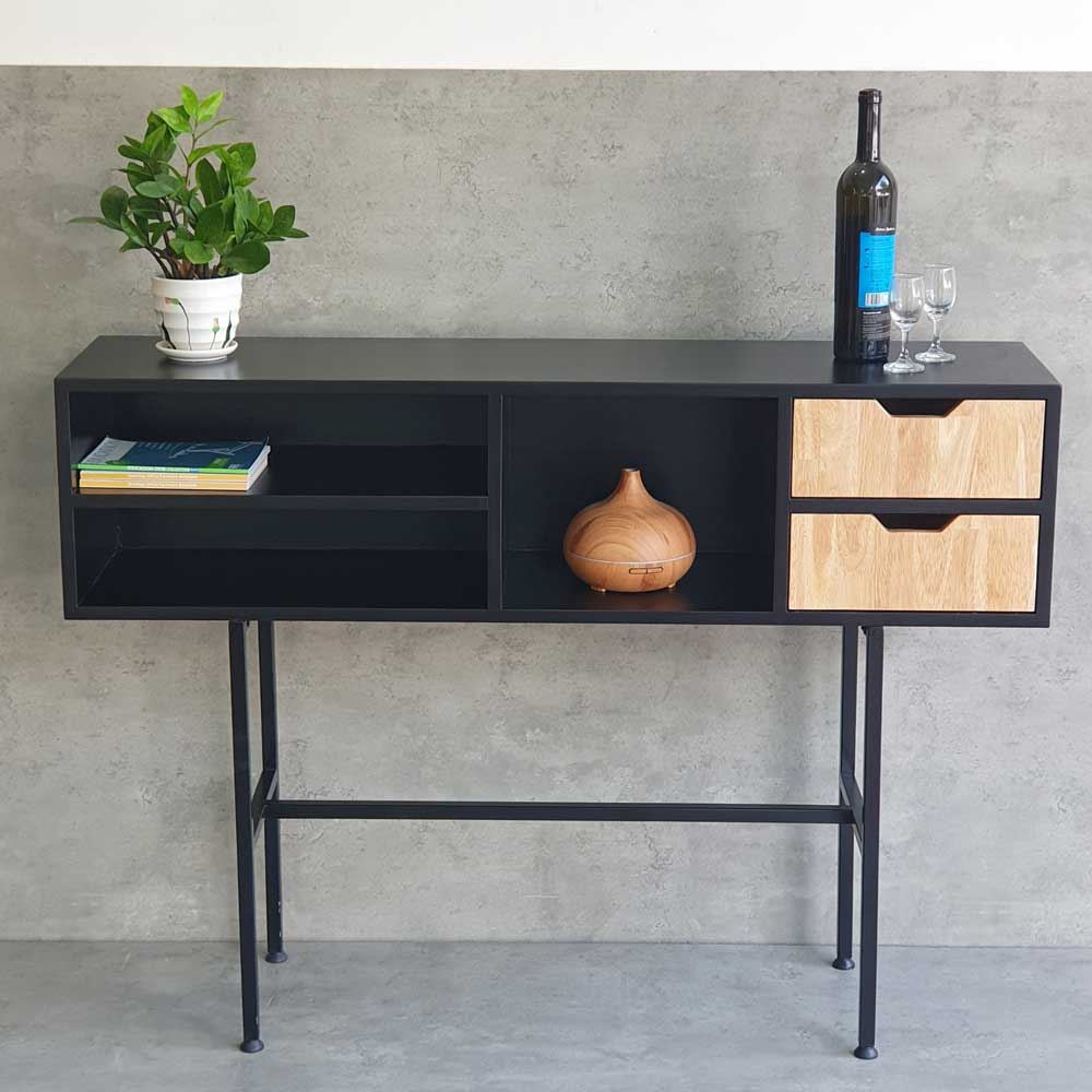 Bàn console CST060 sở hữu kiểu dáng hiện đại với phần mặt gỗ cao su sơn đen, kết hợp khung sắt sắt vuông 20x20mm mang đến sự chắc chắn, cứng cáp cho sản phẩm. Bàn được bố trí thêm 2 hộc kéo giúp bạn tăng không gian trưng bày và lưu trữ các món đồ yêu thích một cách dễ dàng. Gỗ cao su tự nhiên AA, độ dày 17cm, đạt tiêu chuẩn xuất khẩu, vân gỗ đẹp mắt, hoặc bạn có thể yêu cầu màu sắc theo bảng màu HomeOffice.