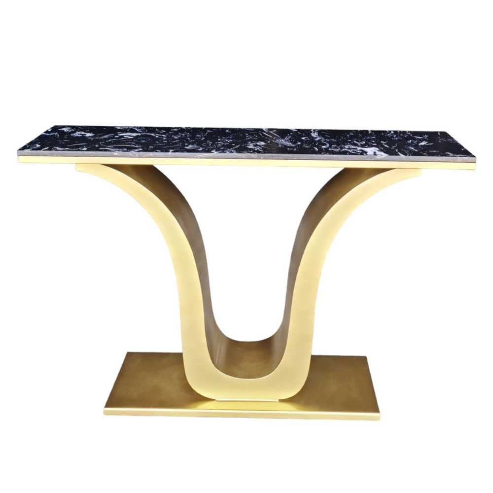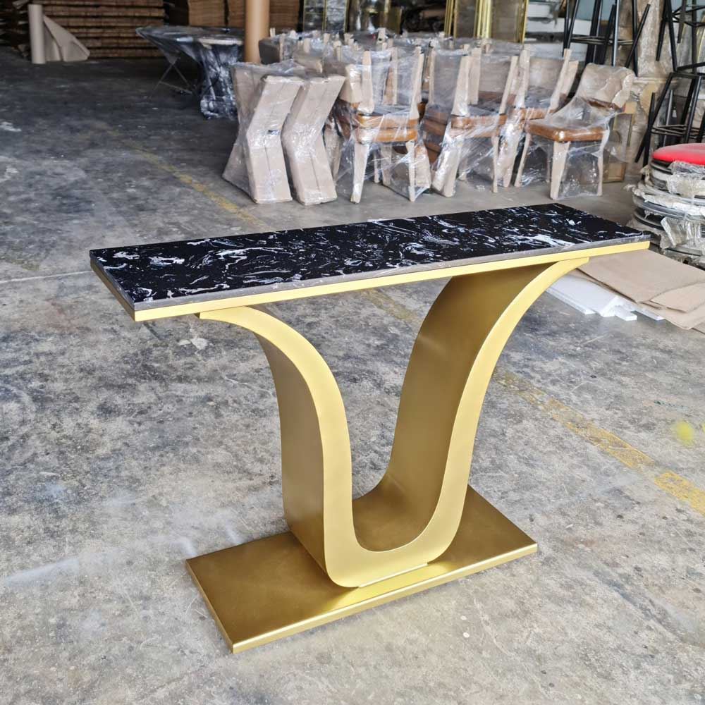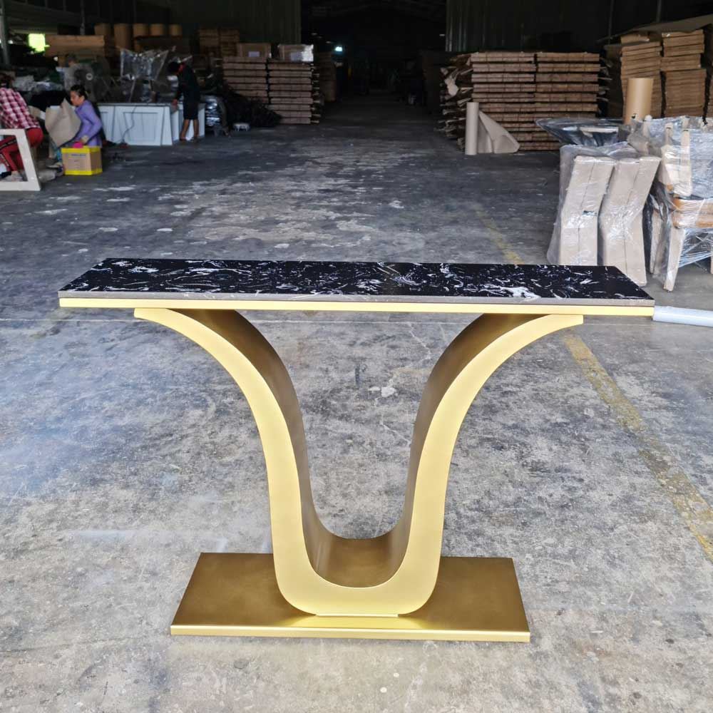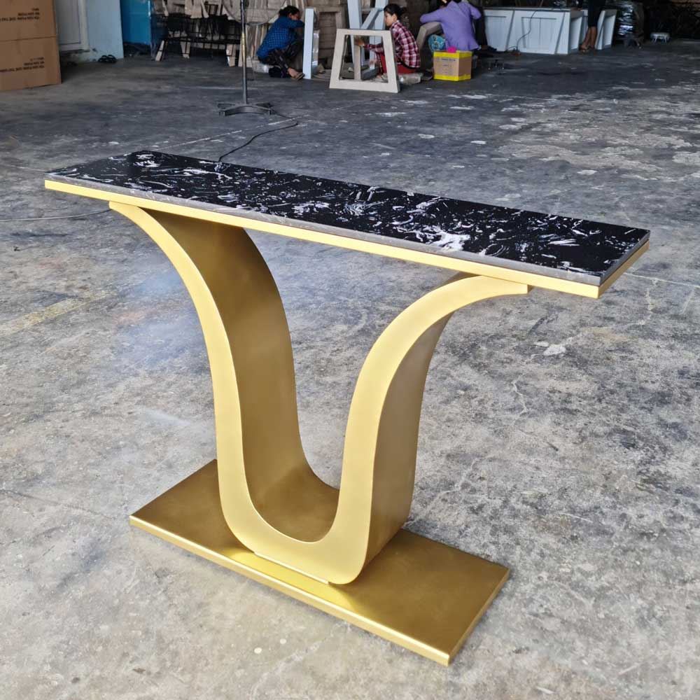 Bàn console CST059 có phần chân sắt được gia công theo hình dáng chữ U độc đáo và ấn tượng, thích hợp để trong các không gian sang trọng. Mặt bàn sử dụng chất liệu đá vân mây đẹp mắt. Bạn có thể đặt để đặt lọ hoa, sách trang trí hoặc các vật dụng trang trí khác để tạo nên một không gian trang trí ấn tượng.