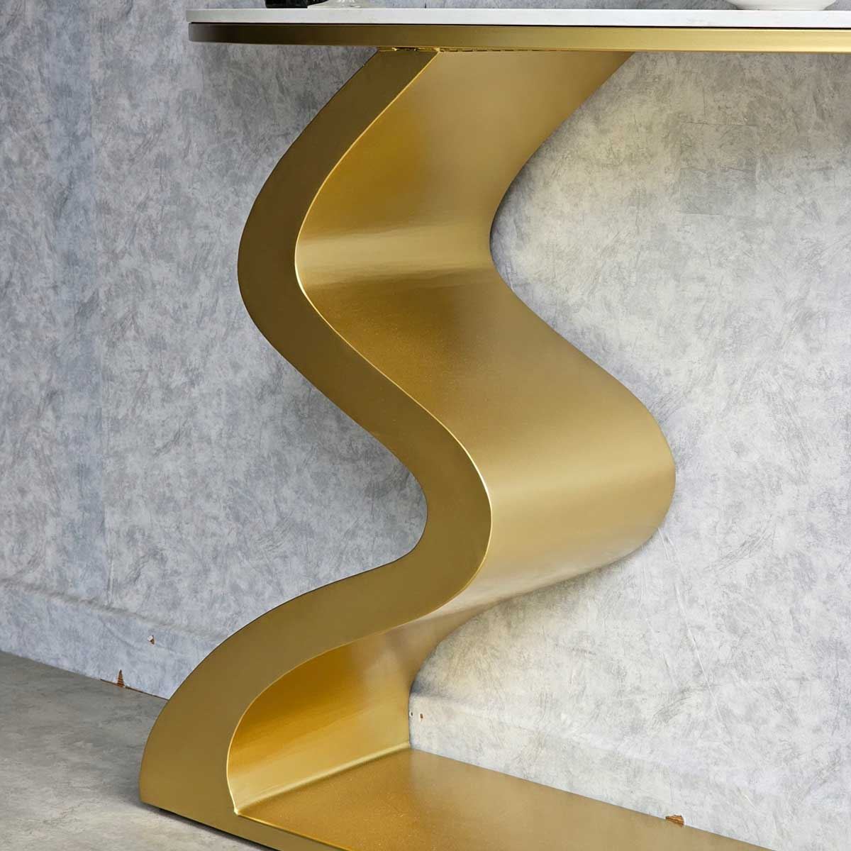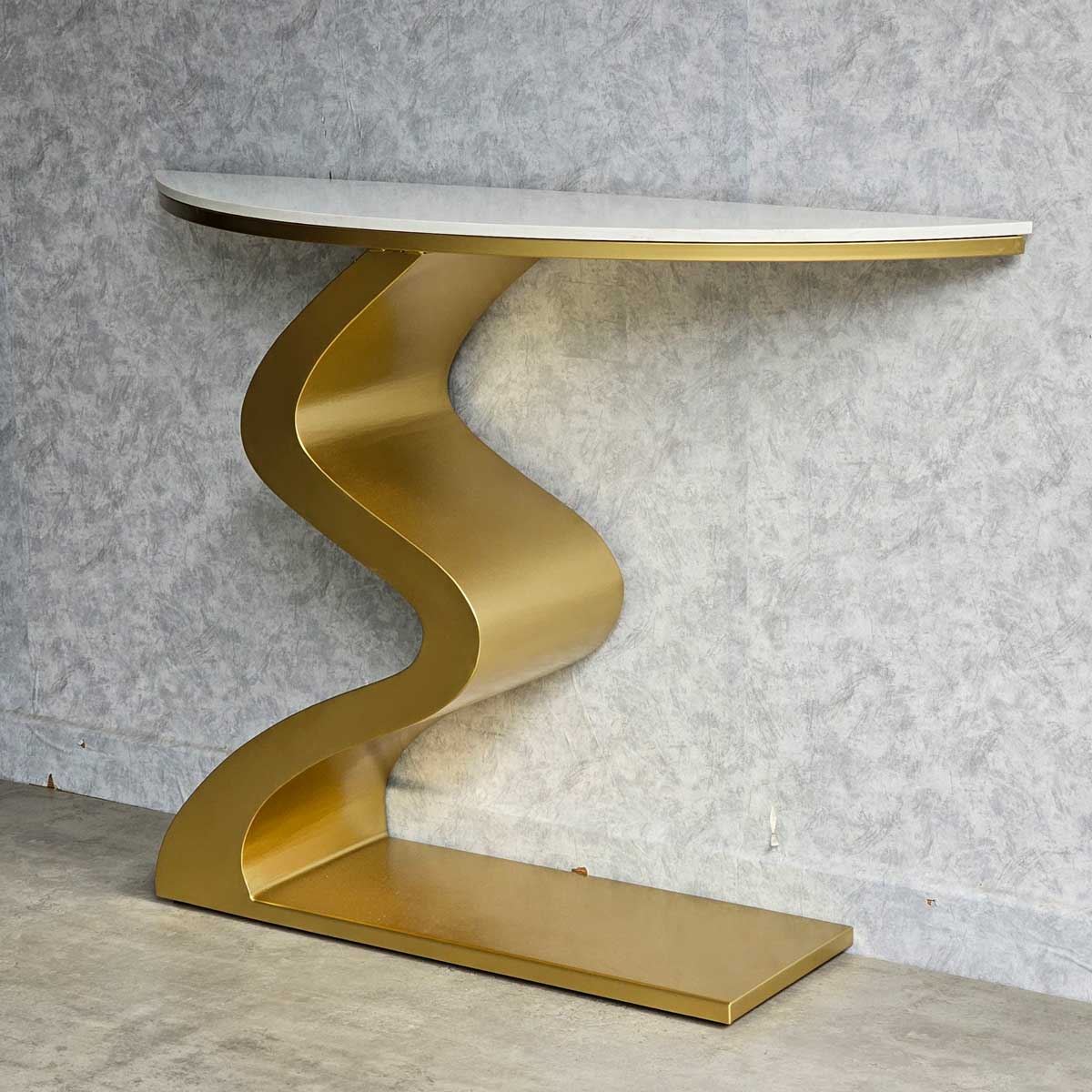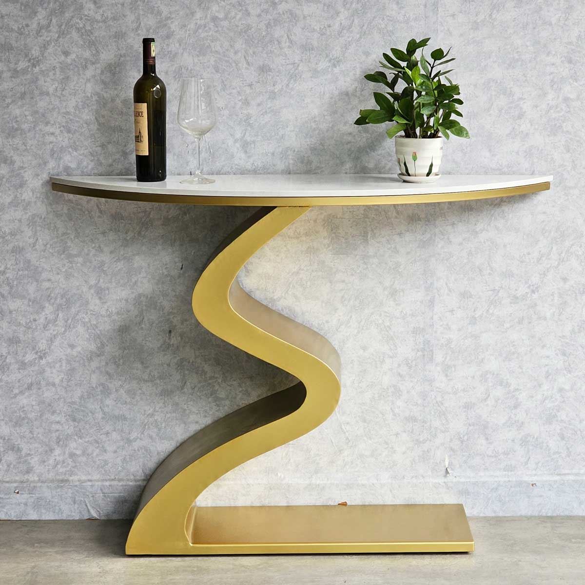 Bàn console CST058 có phần chân sắt được gia công theo hình dáng gợn sóng độc đáo và ấn tượng, thích hợp để trong các không gian sang trọng. Mặt bàn sử dụng chất liệu đá vân mây đẹp mắt. Bạn có thể đặt để đặt lọ hoa, sách trang trí hoặc các vật dụng trang trí khác để tạo nên một không gian trang trí ấn tượng.