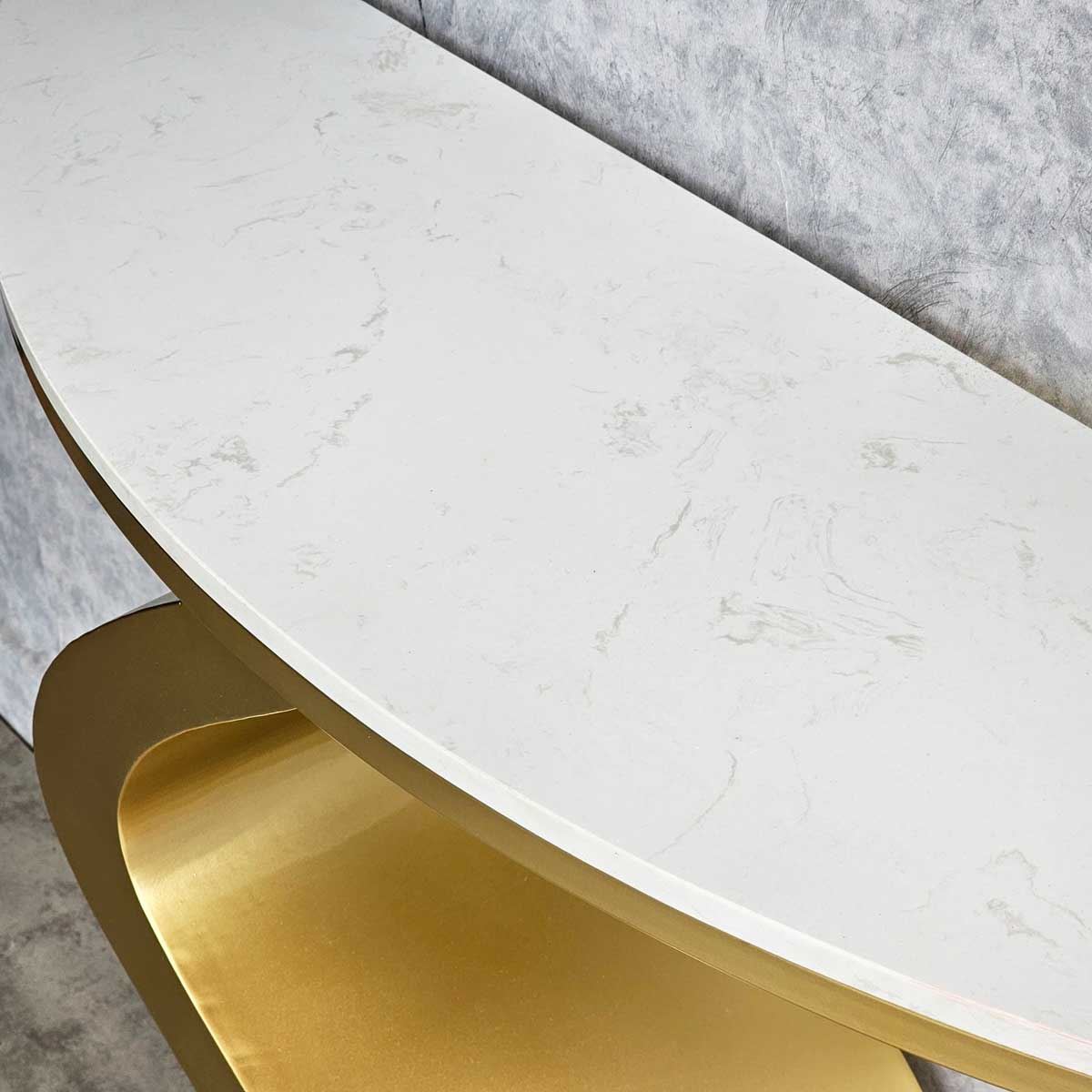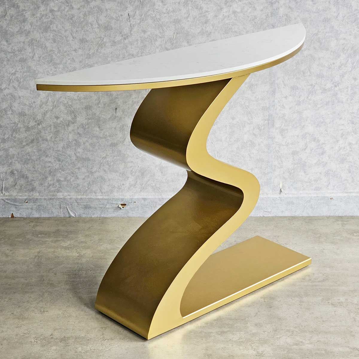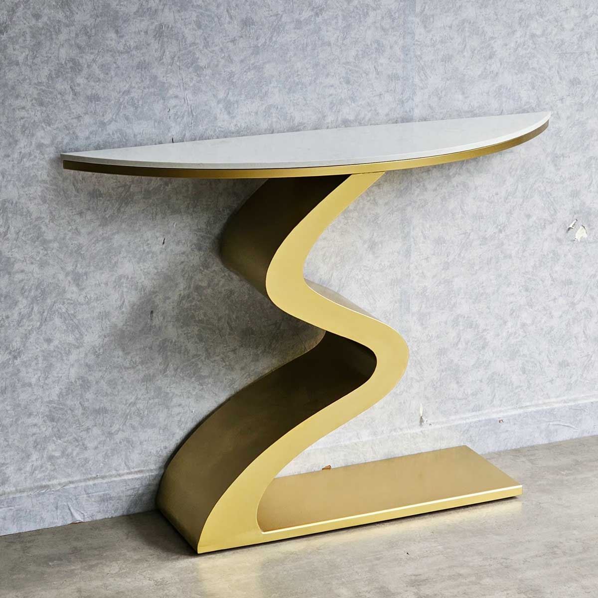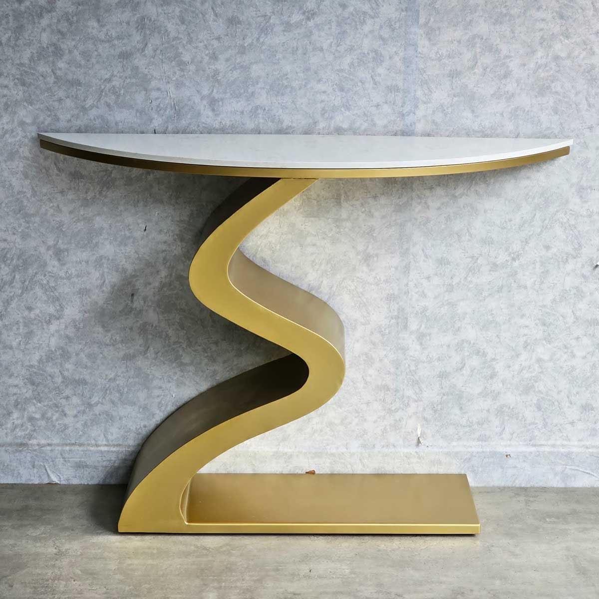 Bàn console CST058 có phần chân sắt được gia công theo hình dáng gợn sóng độc đáo và ấn tượng, thích hợp để trong các không gian sang trọng. Mặt bàn sử dụng chất liệu đá vân mây đẹp mắt. Bạn có thể đặt để đặt lọ hoa, sách trang trí hoặc các vật dụng trang trí khác để tạo nên một không gian trang trí ấn tượng.