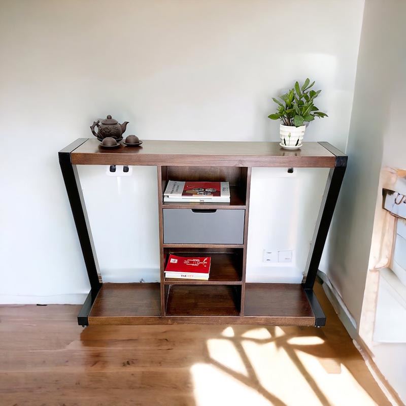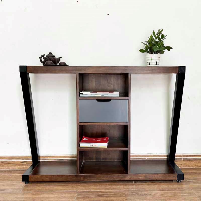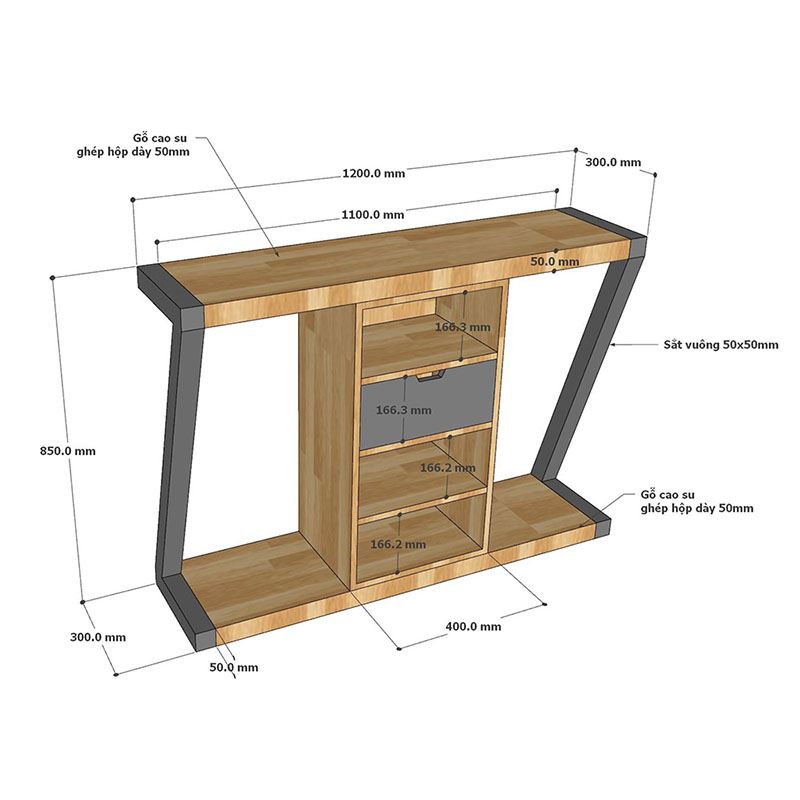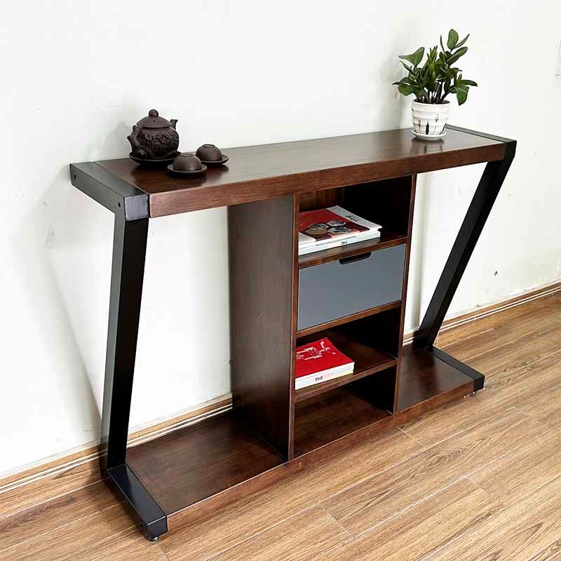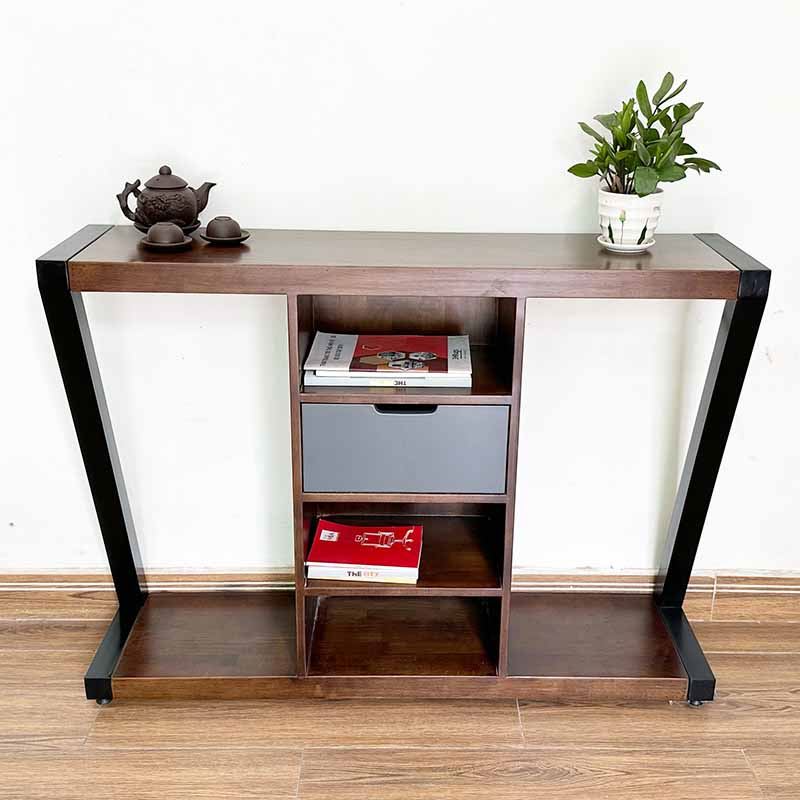 Bàn console bàn trang trí mặt gỗ khung sắt CST049 sở hữu kiểu dáng mạnh mẽ với phần mặt gỗ ghép hộp dày 5cm kết hợp khung sắt chữ Z sắt vuông 50mm mang đến sự chắc chắn, cứng cáp cho sản phẩm. Thiết kế 3 tầng kết hợp hộc kéo ở phần giữa bàn giúp bạn tăng không gian trưng bày và lưu trữ các món đồ yêu thích một cách dễ dàng. Gỗ cao su tự nhiên sơn màu góc chó cực đẹp mắt, hoặc bạn có thể yêu cầu màu sắc theo bảng màu HomeOffice.