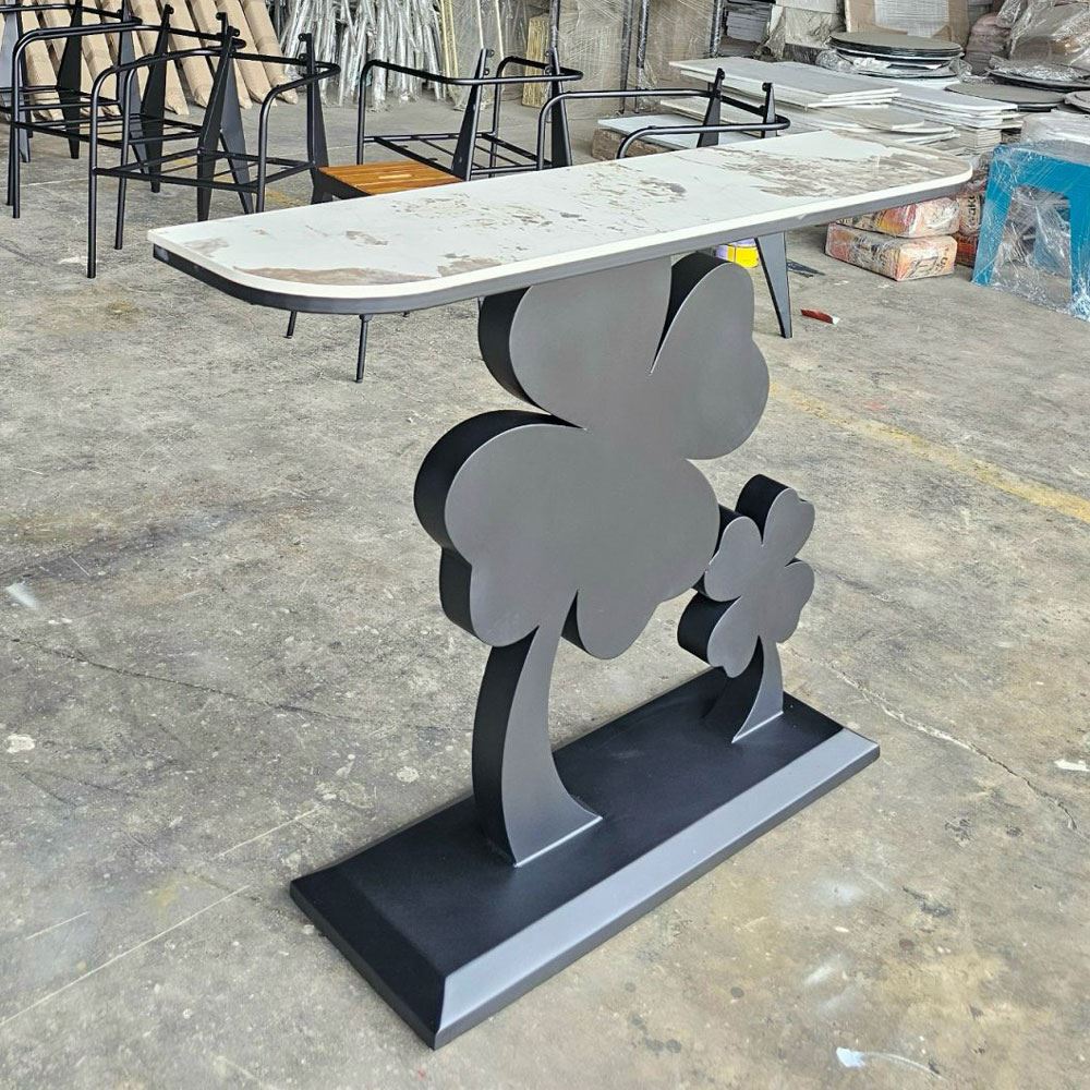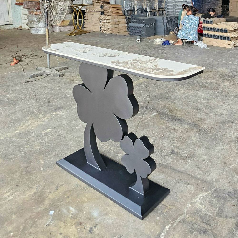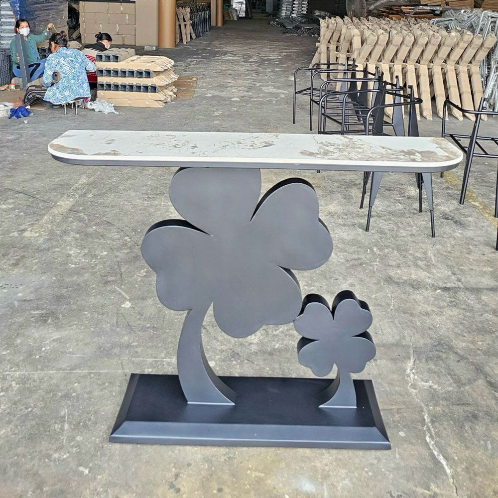 Bàn Console CST070 có phần chân sắt được gia công theo hình cỏ 4 lá may mắn độc đáo và thẩm mỹ, thích hợp để trong các không gian sang trọng, hiện đại. Mặt bàn sử dụng chất liệu đá vân mây đẹp mắt. Bạn có thể đặt để đặt lọ hoa, sách trang trí hoặc các vật dụng trang trí khác để tạo nên một không gian trang trí ấn tượng.