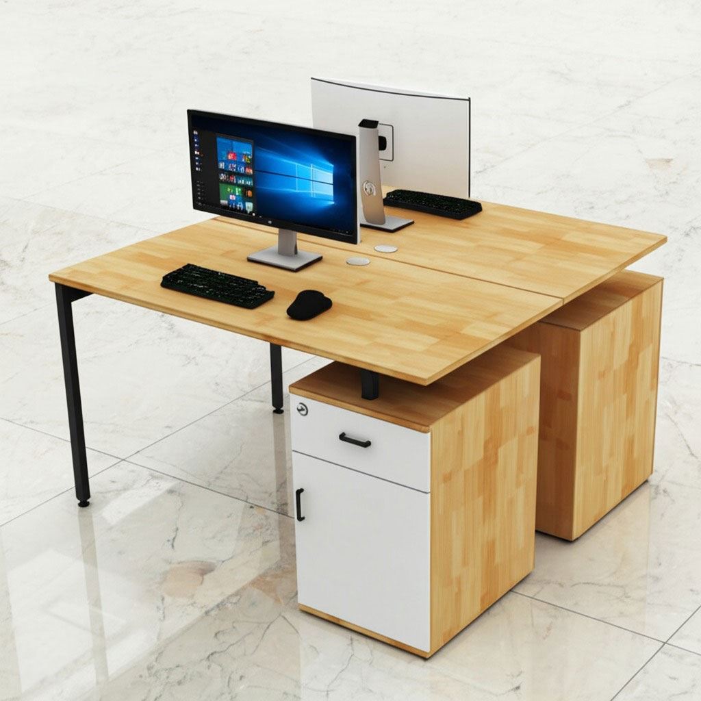 Bàn sử dụng chất liệu gỗ cao su chuẩn AA dày 17mm PU màu gỗ tự nhiên luôn có một vẻ đẹp riêng, thân thiện với môi trường, đối với các văn phòng mở, văn phòng kết hợp với cây xanh thì việc sử dụng bàn gỗ cao su chân sắt kết hợp trở nên hoàn hảo. Gỗ được xử lý qua 4 công đoạn trước khi PU hoàn thiện cho bề mặt sản phẩm rất đẹp mắt, chống nước tuyệt đối. Khung chân sắt sơn tĩnh điện với cơ cấu ngàm lắp ráp dễ dàng, giúp vận chuyển dễ dàng và linh hoạt.