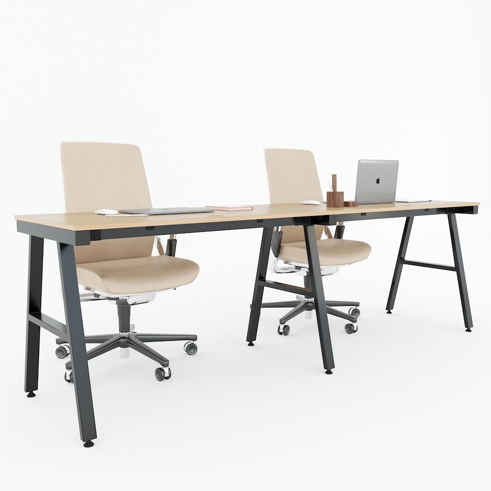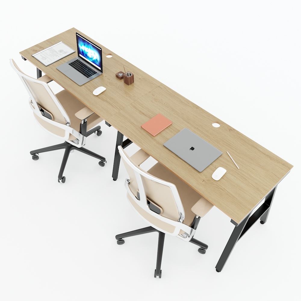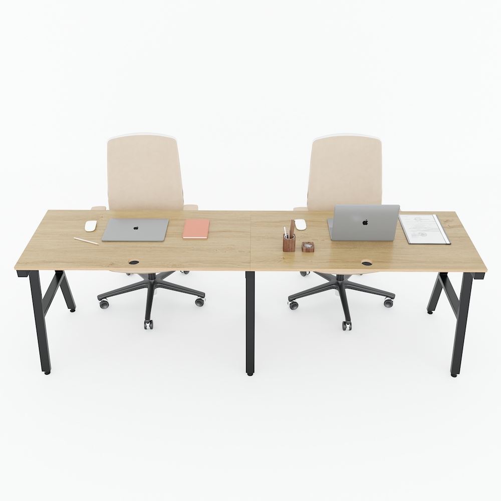 Bàn cụm 2 240x60cm gỗ Plywood phủ melamin chân sắt Aconcept HBAC040 với mặt bàn gỗ Plywood cốt gỗ tự nhiên bề mặt phủ melamin vân sồi đẹp mắt, bề mặt bàn được xử lý chống thấm nước và cong vênh, màu gỗ tự nhiên đẹp mắt mang đến sự thân thiện, gần gũi cho không gian làm việc của bạn. Kết hợp với mặt gỗ Plywood là hệ khung chân sắt Aconcept cơ cấu lắp ráp ngàm thông minh, tiện lợi nhưng vẫn đảm bảo độ chắc chắn, bề mặt sắt phủ lớp sơn tĩnh điện chất lượng cao bền bỉ theo thời gian. Mặt bàn kích thước 240x60cm, mỗi người sử dụng đủ 60x120cm theo tiêu chuẩn kích thước bàn làm việc hiện nay.