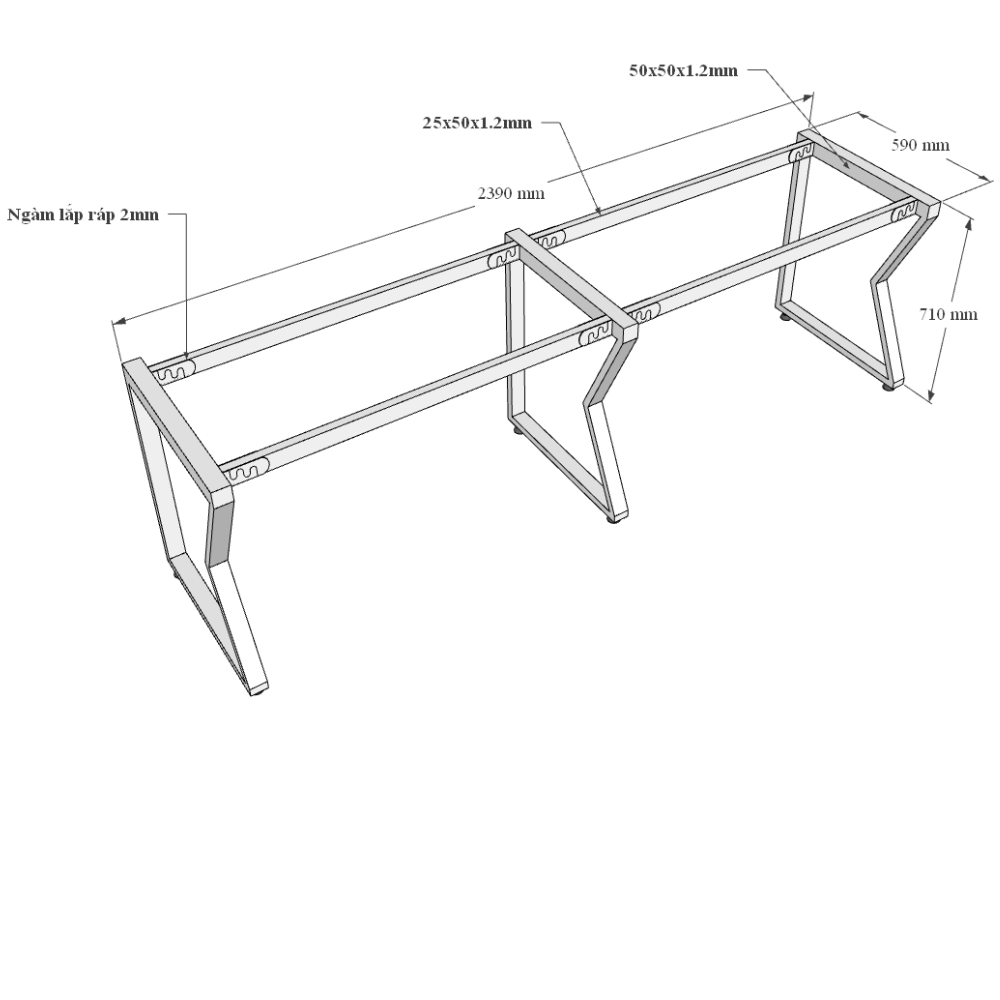 Giải pháp bàn cụm 2 chỗ ngồi song song giúp tiện kiệm không chỉ chi phí mà còn là tiết kiệm không gian cho không gian ngồi thoáng hơn, mỗi người sử dụng đủ 60x120cm mặt bàn rất tiện lợi, kiểu chân lắp ráp nối tiếp với 3 chân trụ và 4 thanh giằng nối tiếp rất chắc chắn. Chân bàn sử dụng sắt hộp 25x50mm và sắt hộp 50x50mm dày 1.2mm rất bền chắc thêm sơn tĩnh điện chất lượng cao cho hệ bàn cao cấp sử dụng thời gian rất dài