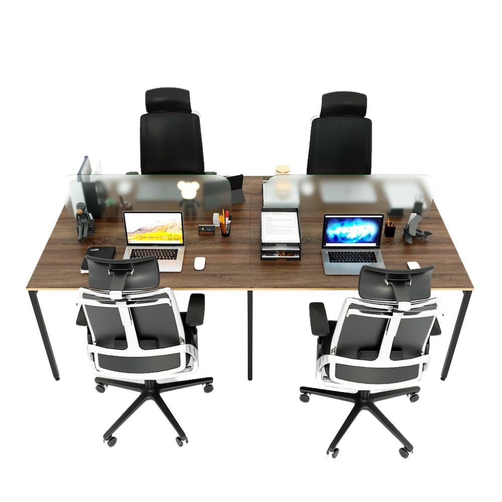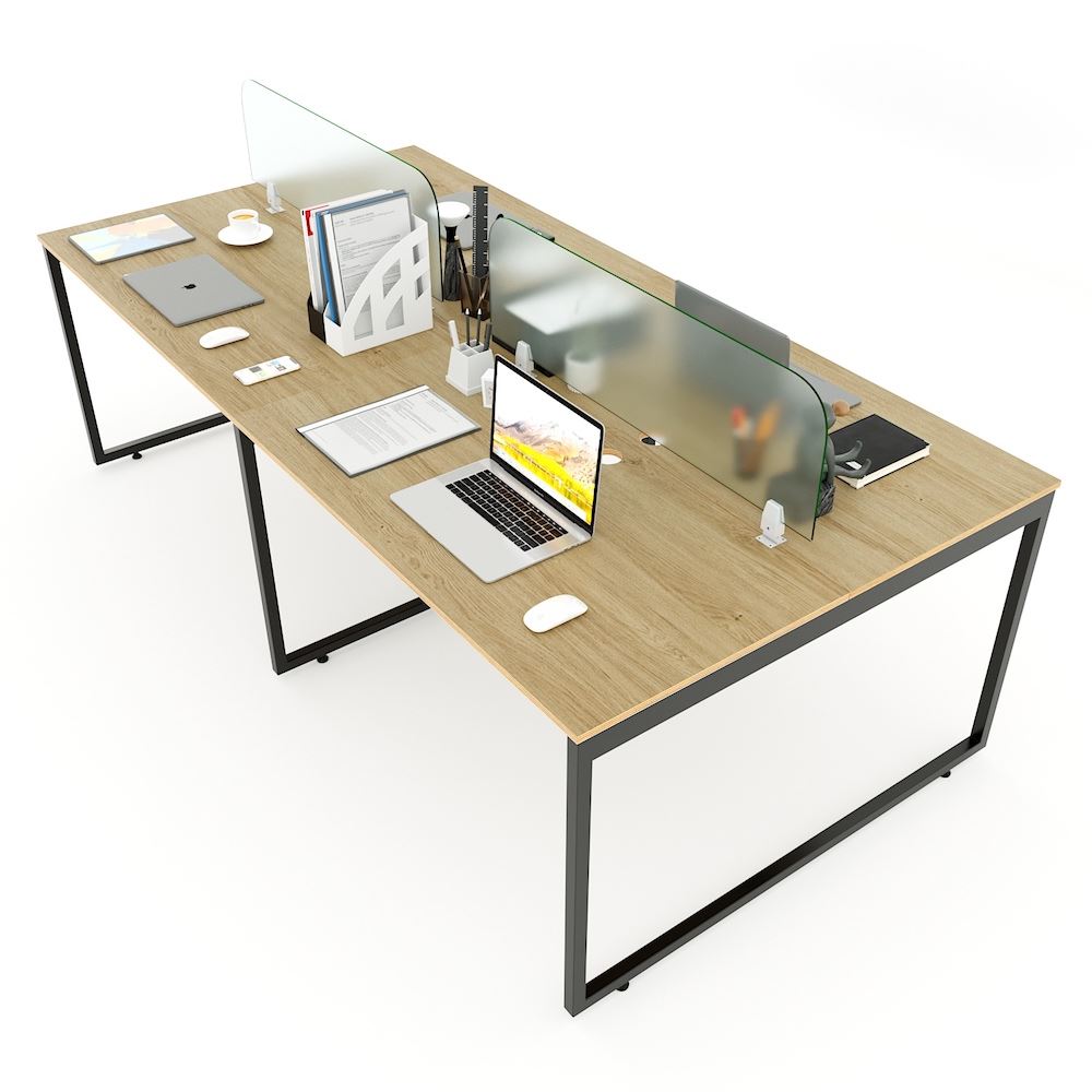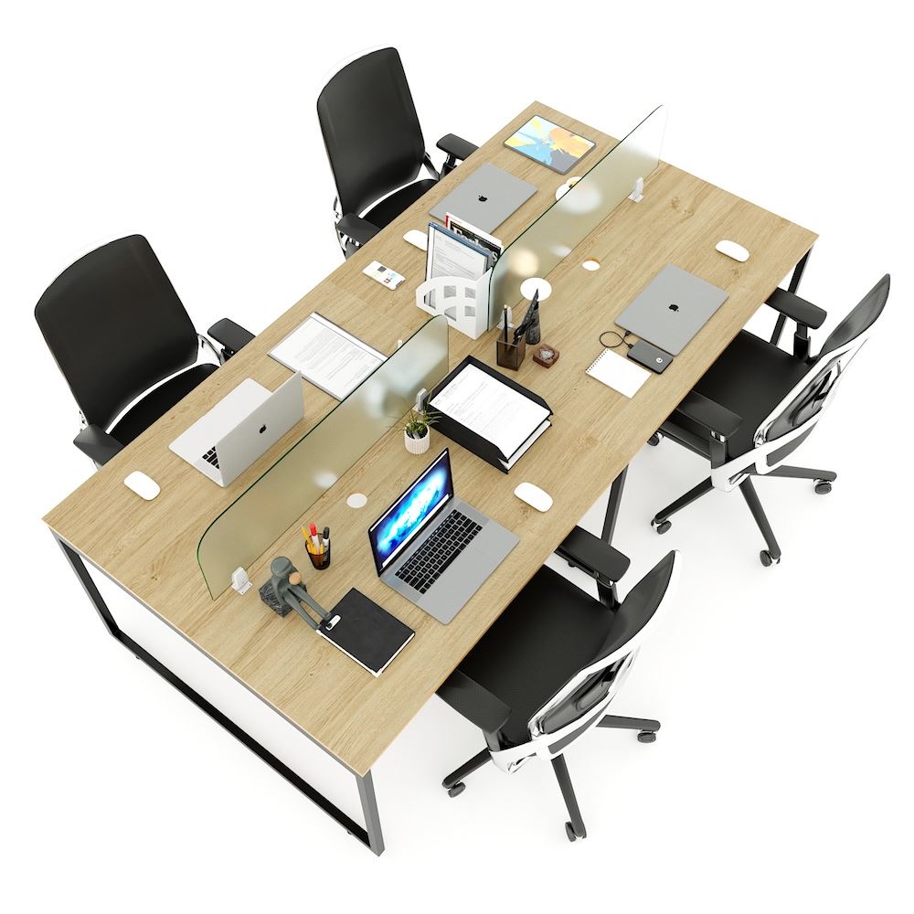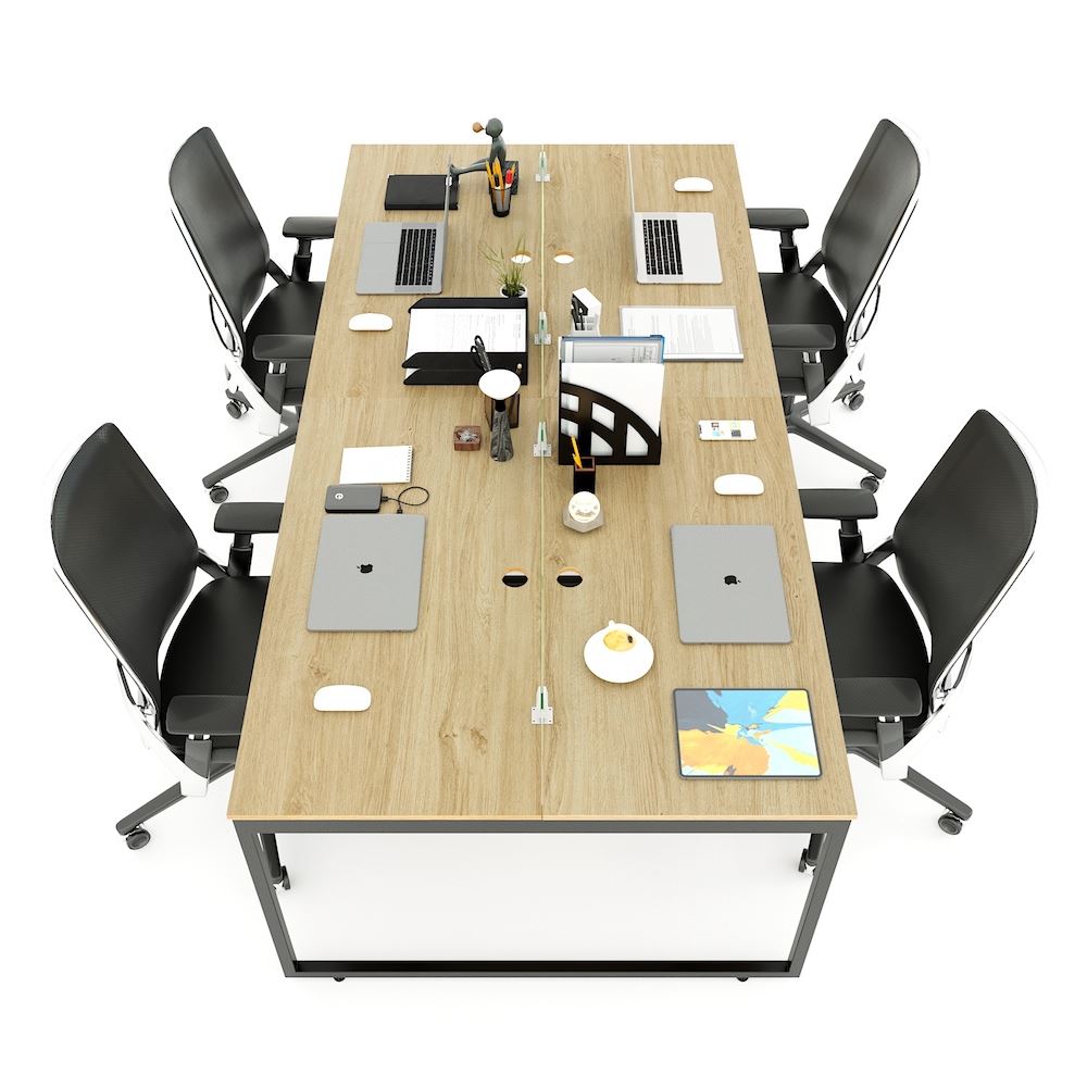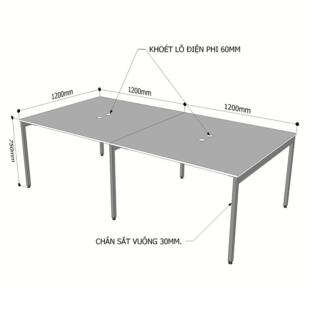 Mặt bàn kích thước 240x120cm dành cho 4 người ngồi, mỗi người sử dụng 120x60cm - đây là kích thước tiêu chuẩn bàn làm việc đơn văn phòng. Chiều cao tiêu chuẩn bàn làm việc 75cm phù hợp với hầu hết các ghế văn phòng hiện nay.