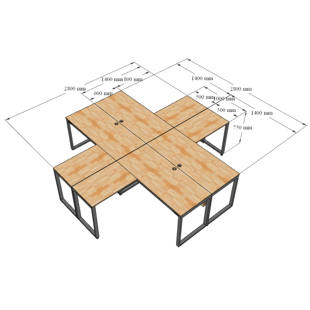 HBRT028 - Bàn cụm 4 góc chữ L nối tiếp Rectang Concept là bộ sản phẩm 4 bàn góc chữ L nối tiếp ghép lại tạo thành cụm 4 chỗ ngồi với góc chữ L rộng rãi tạo không gian bao quát mặt bàn cho người sử dụng. Gồm 4 bàn góc chữ L 140x140cm với mặt bàn chính kích thước 60x140cm và mặt bàn phụ kích thước 80x50cm.