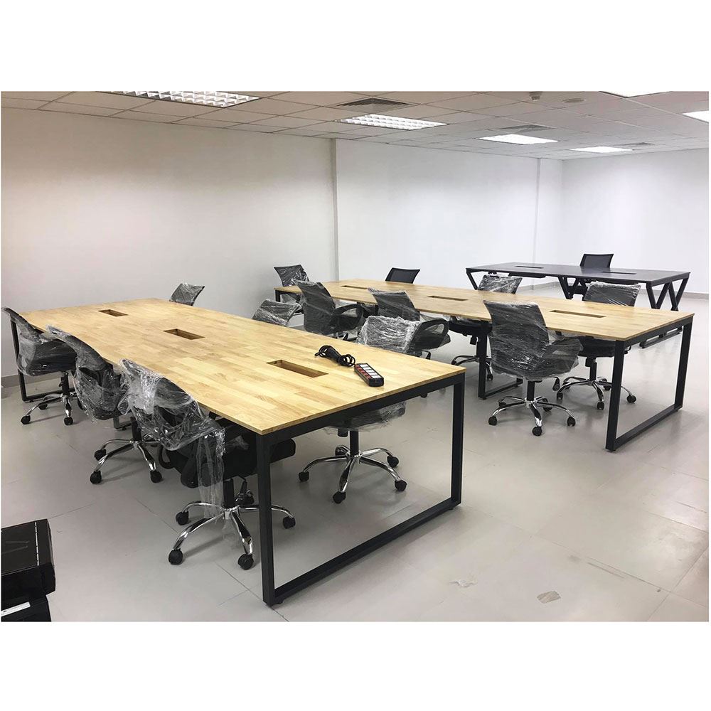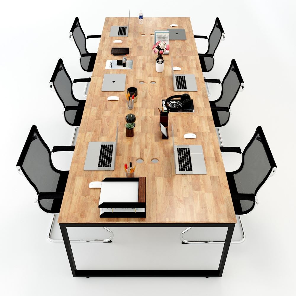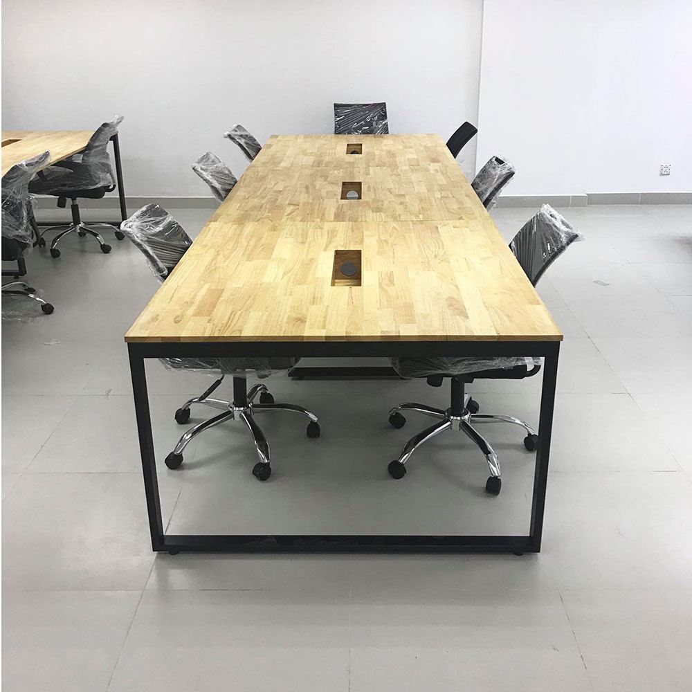 Bàn Cụm 6 HBRT013 Rectang Concept chân sắt chữ nhật 25x50. Bàn văn phòng gỗ cao su ghép tiêu chuẩn AA dày 17mm PU màu gỗ tự nhiên luôn có một vẻ đẹp riêng, thân thiện với môi trường, đối với các văn phòng mở, văn phòng kết hợp với cây xanh thì việc sử dụng bàn gỗ cao su chân sắt kết hợp trở nên hoàn hảo. Chất liệu gỗ cao su tại HomeOffice là gỗ ghép dày 17mm tiêu chuẩn AA ( 2 mặt đẹp) được xử lý qua 4 công đoạn trước khi PU hoàn thiện cho bề mặt sản phẩm rất đẹp mắt, chống nước tuyệt đối. Khung chân sắt sơn tĩnh điện với cơ cấu ngàm lắp ráp dễ dàng.
