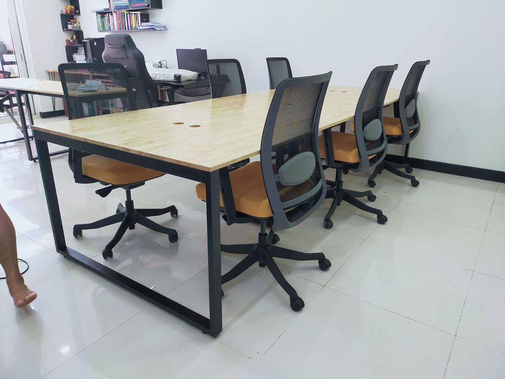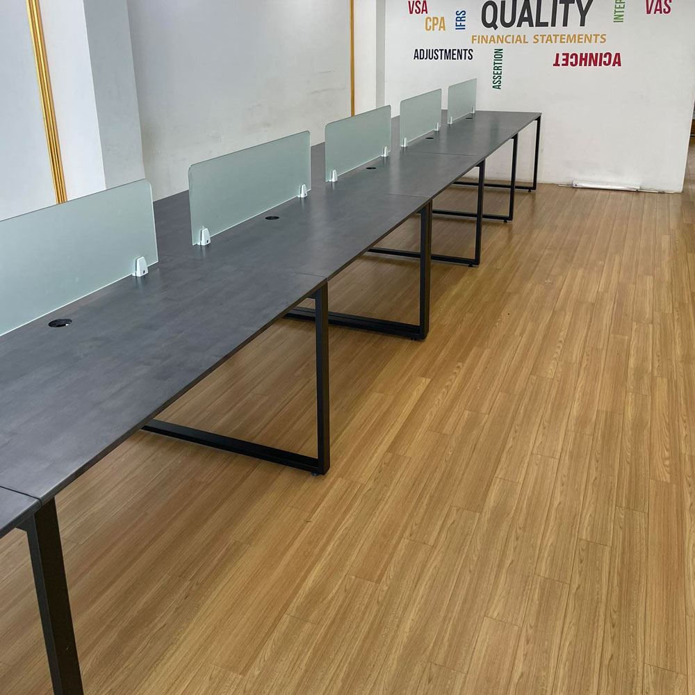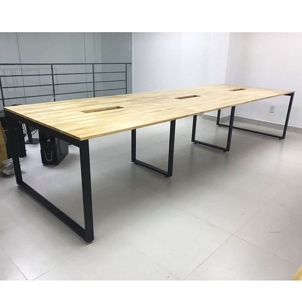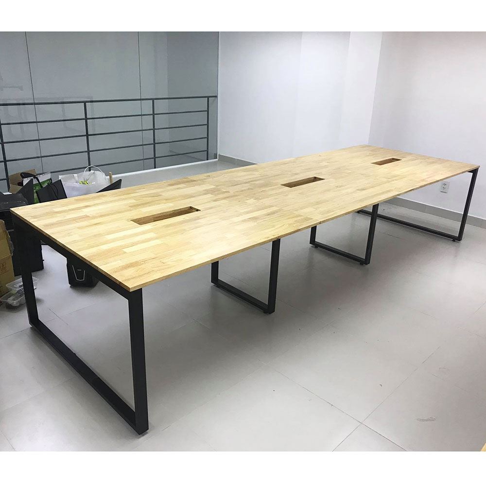 Bàn Cụm 6 HBRT013 Rectang Concept chân sắt chữ nhật 25x50. Bàn văn phòng gỗ cao su ghép tiêu chuẩn AA dày 17mm PU màu gỗ tự nhiên luôn có một vẻ đẹp riêng, thân thiện với môi trường, đối với các văn phòng mở, văn phòng kết hợp với cây xanh thì việc sử dụng bàn gỗ cao su chân sắt kết hợp trở nên hoàn hảo. Chất liệu gỗ cao su tại HomeOffice là gỗ ghép dày 17mm tiêu chuẩn AA ( 2 mặt đẹp) được xử lý qua 4 công đoạn trước khi PU hoàn thiện cho bề mặt sản phẩm rất đẹp mắt, chống nước tuyệt đối. Khung chân sắt sơn tĩnh điện với cơ cấu ngàm lắp ráp dễ dàng.