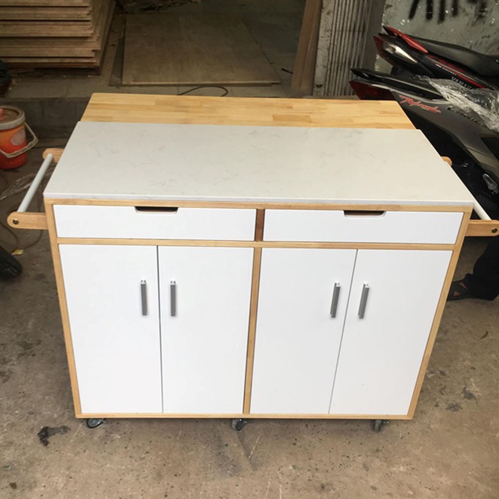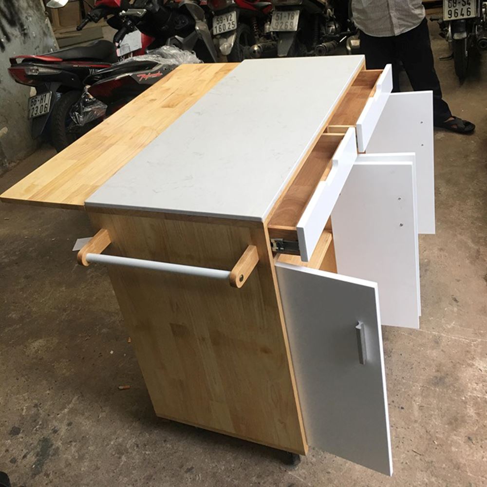 KIS68004 - Bàn đảo bếp di động có bánh xe mặt đá (110x50x90cm) với chất liệu gỗ cao su tiêu chuẩn AA dày 17mm sơn Pu màu gỗ tự nhiên đẹp, cửa tủ và cửa hộc kéo ván MDF lõi xanh chống ẩm sơn Pu màu trắng, bàn có 6 bánh xe chất lượng cao với mặt đá nhân tạo vân mây dày 15mm. Bàn có thể mở rộng với kệ mặt gấp rộng 30cm.
