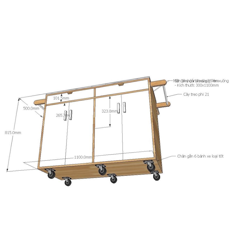 Kích thước phủ bì 1100x800x900mm phù hợp với không gian đảo bếp nhỏ có thể di động di chuyển khắp phòng, kệ hộc kéo và cửa mở giúp không gian lưu trữ lớn, bên cạnh đó còn có 2 cây treo khăn hai bên, có thể dùng làm đảo bếp hoặc bàn làm bánh trong gia đình.