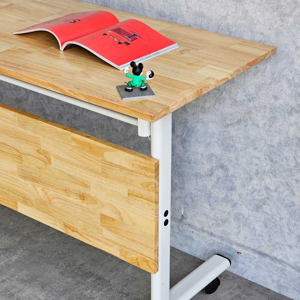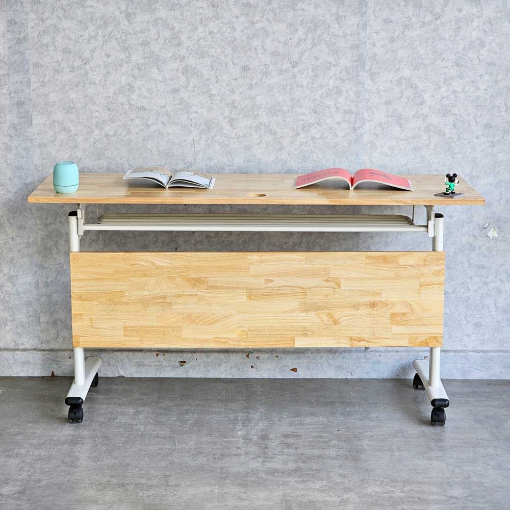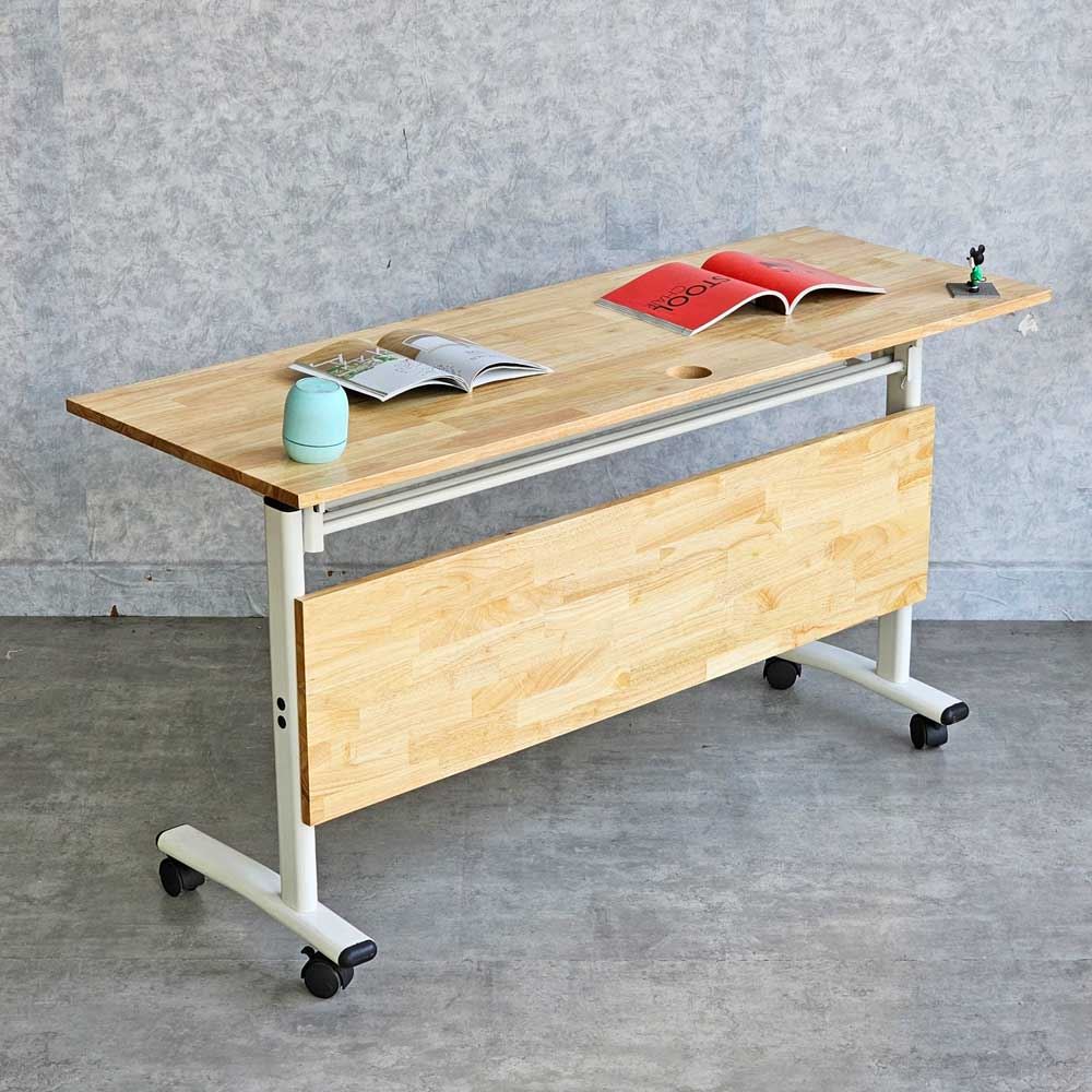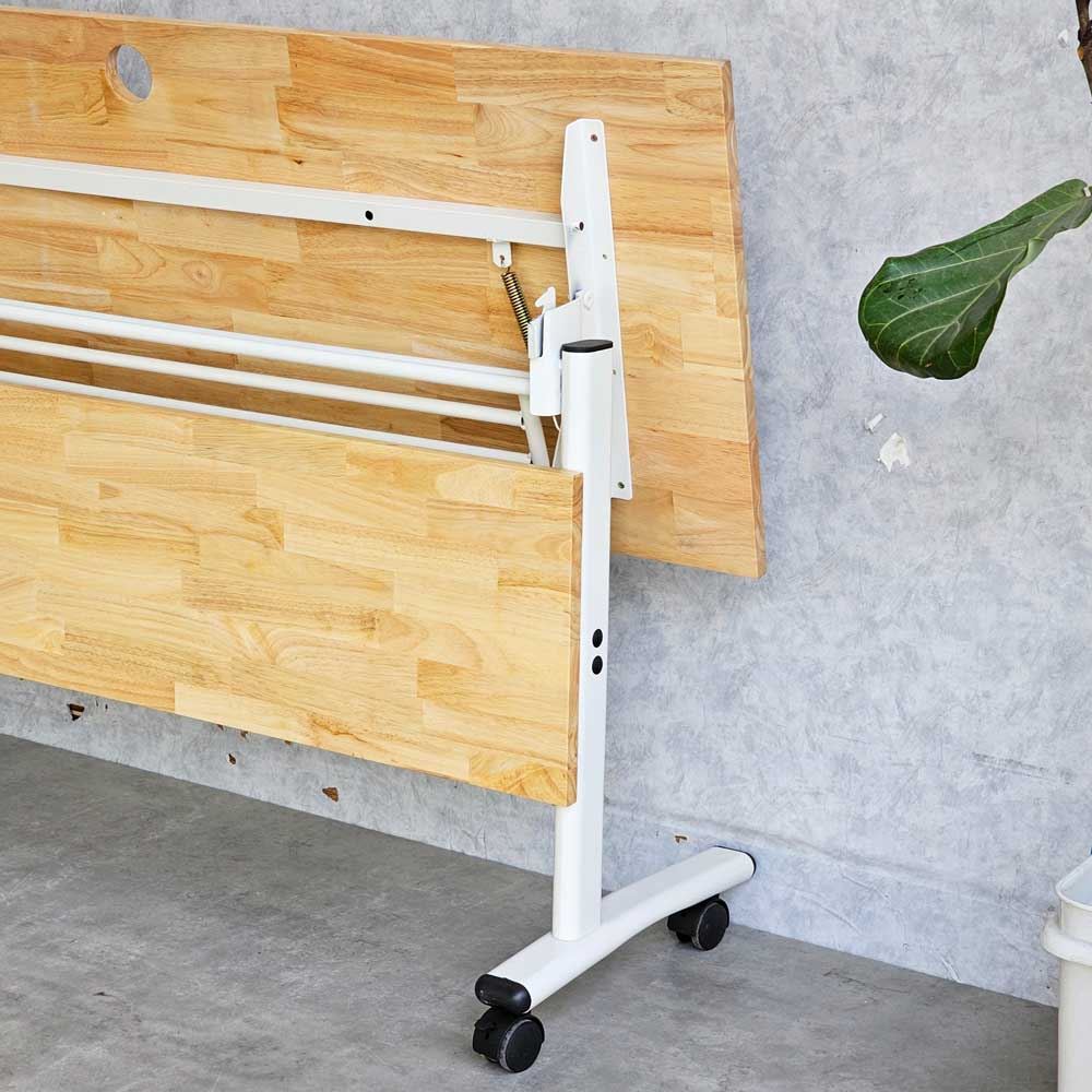 Mặt bàn gấp gọn giúp tiết kiệm diện tích tối đa khi không sử dụng, đồng thời tạo sự gọn gàng cho không gian. Bên cạnh đó, thiết kế có bánh xe di động giúp bạn dễ dàng di chuyển bàn đến mọi vị trí mong muốn, phù hợp cho nhiều mục đích sử dụng như học tập, làm việc, họp nhóm hay giải trí.