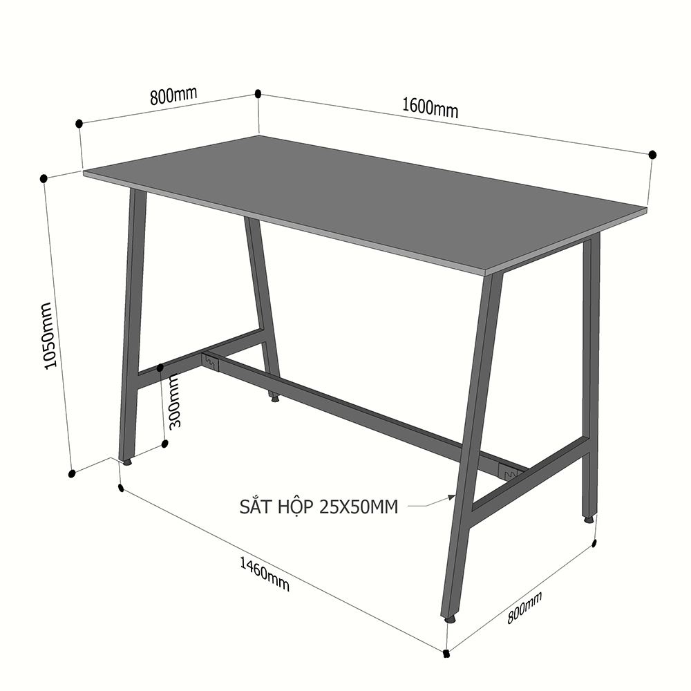 Kích thước bàn đứng 1m6 gỗ cao su chân sắt lắp ráp