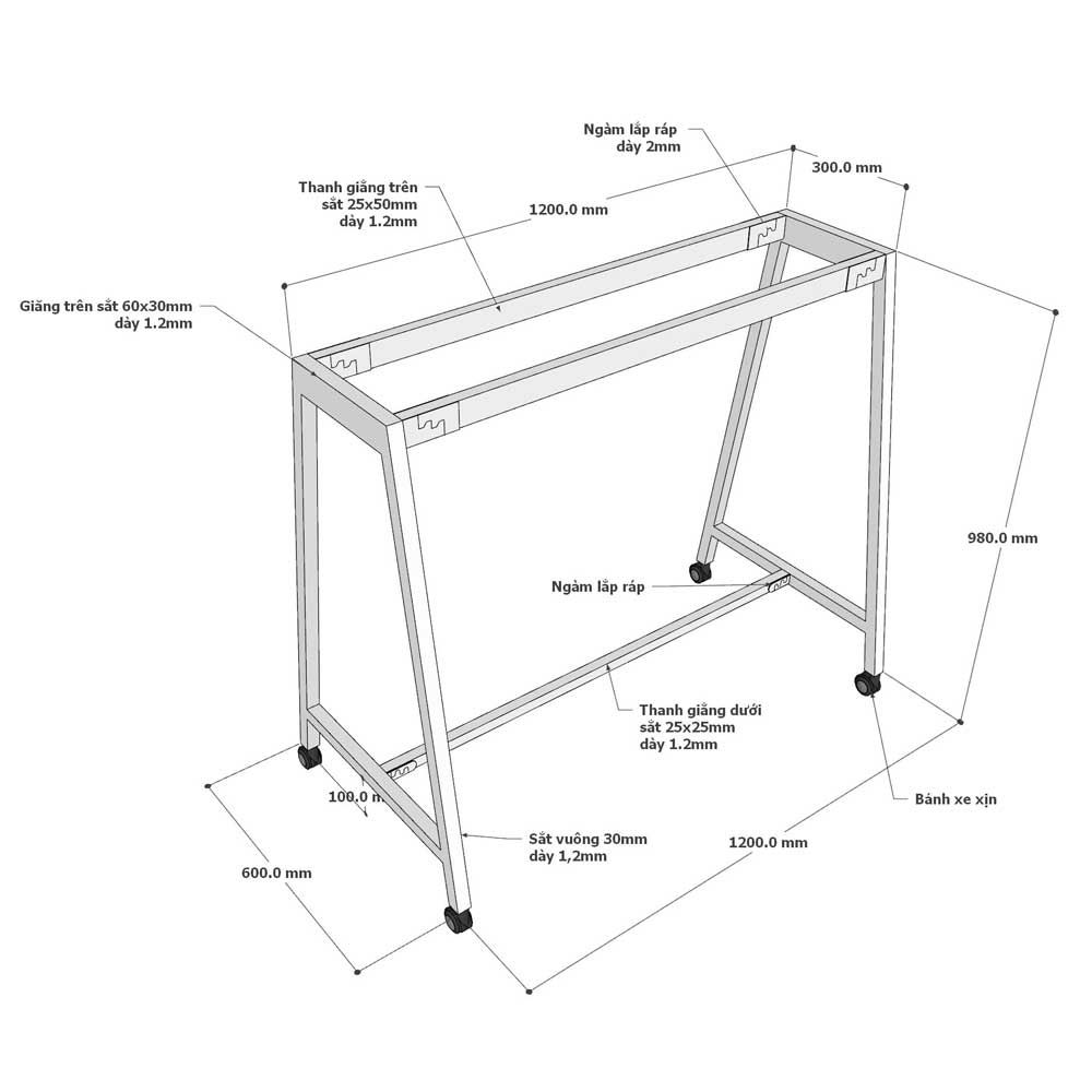 Bản vẽ chi tiết kích thước bàn làm việc đứng có bánh xe di động