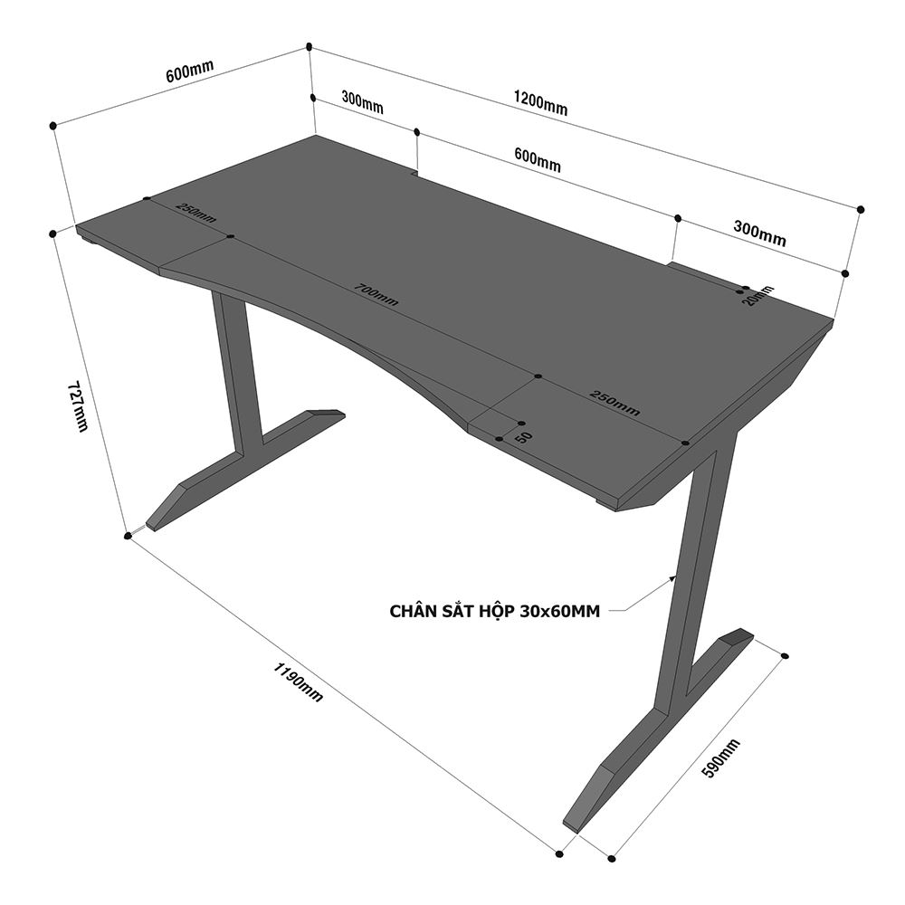 Kích thước mặt bàn là 120x60 cm, giúp nó có thể để vừa trong những không gian nhỏ hẹp. Mặc dù sở hữu kích thước không quá lớn, nhưng nó hoàn toàn có thể giúp bạn đặt vừa một bộ máy tính chơi game chuyên nghiệp cùng những thiết bị theo kèm. Bên cạnh kích thước 120x60cm, bạn có thể lựa chọn những kích thước khác lớn hơn tại HomeOffice như 120x70cm, 140x60cm hay 140x70cm đều có cả.