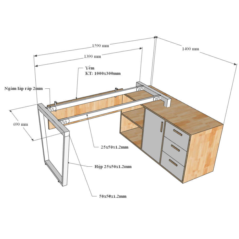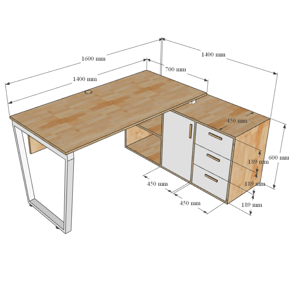 Kích thước chi tiết bàn giám đốc gác tủ 160x140cm mặt bàn chính 140x70cm