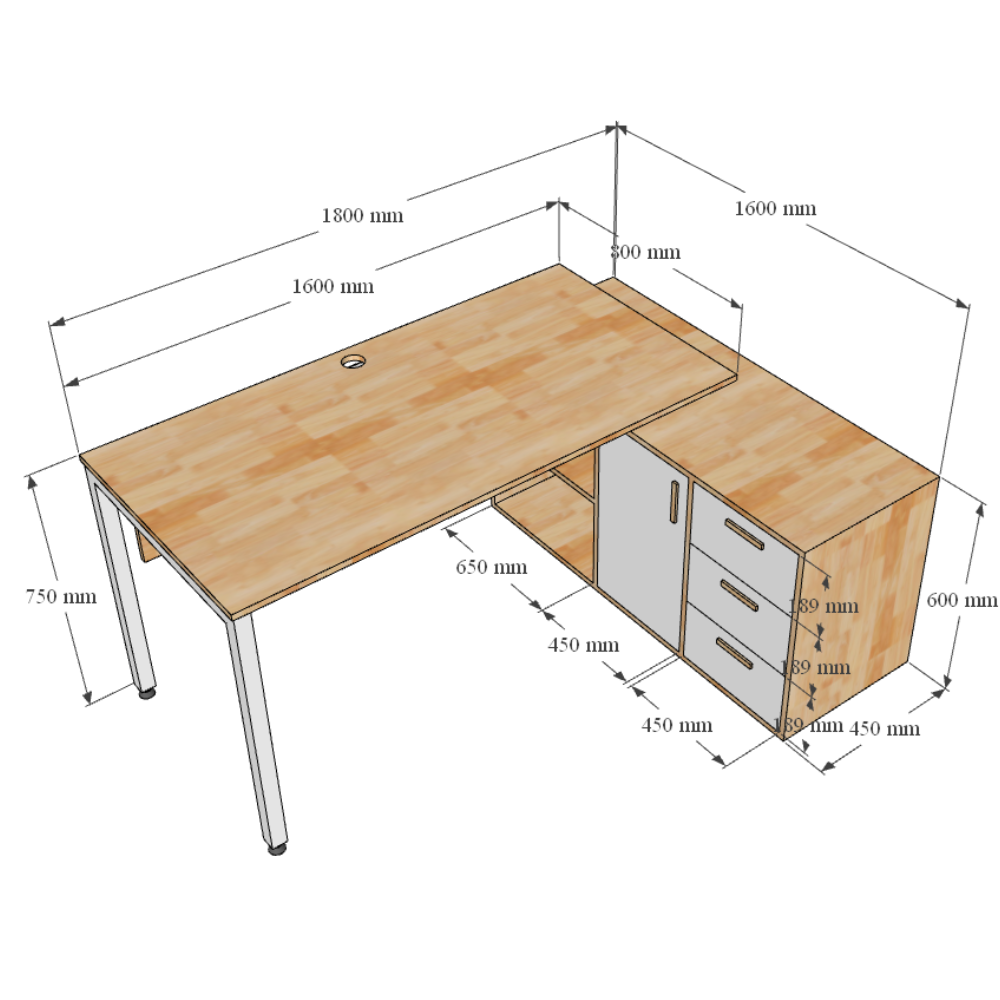Kích thước chi tiết bàn giám đốc gác tủ 180x160cm mặt bàn chính 160x80cm