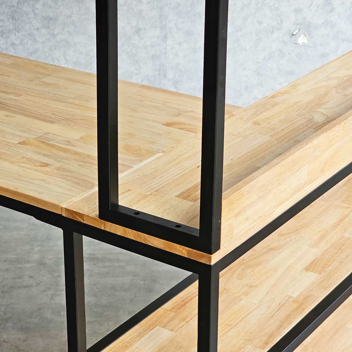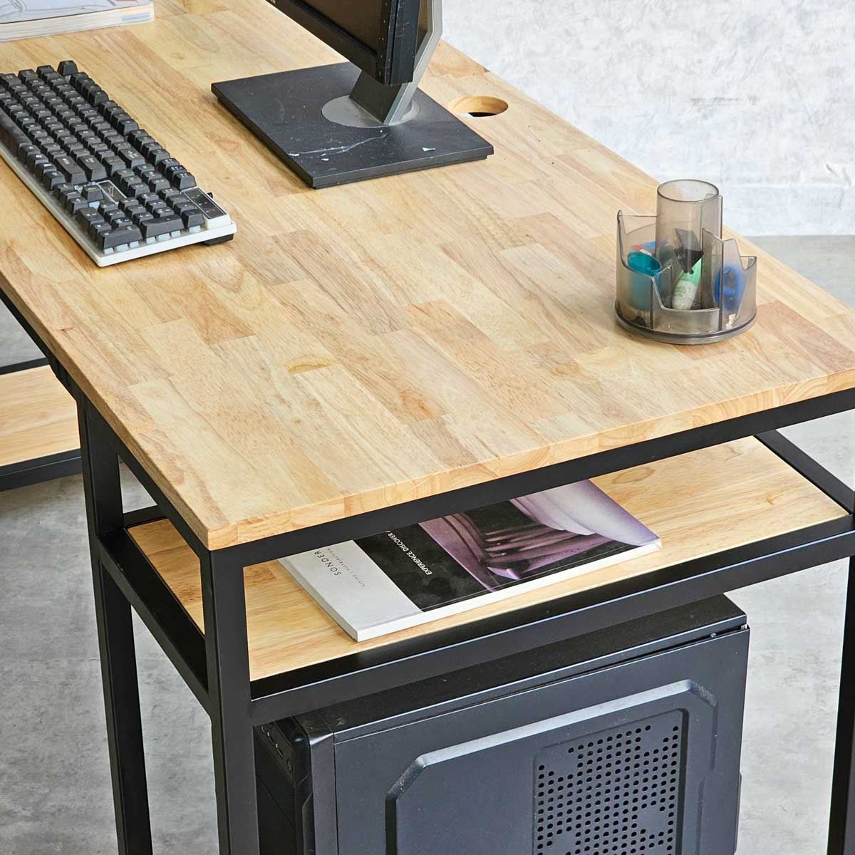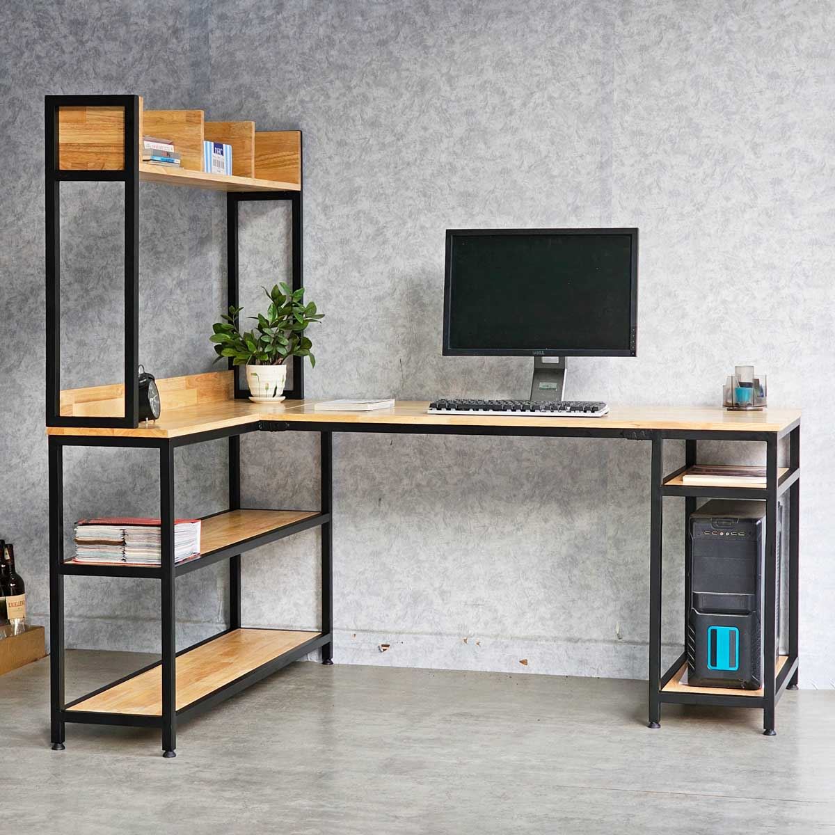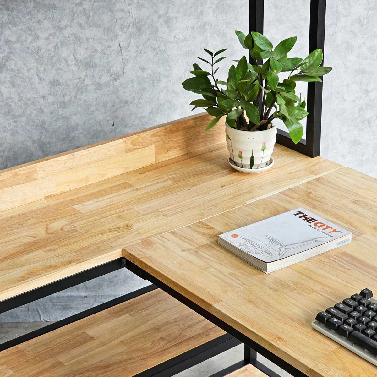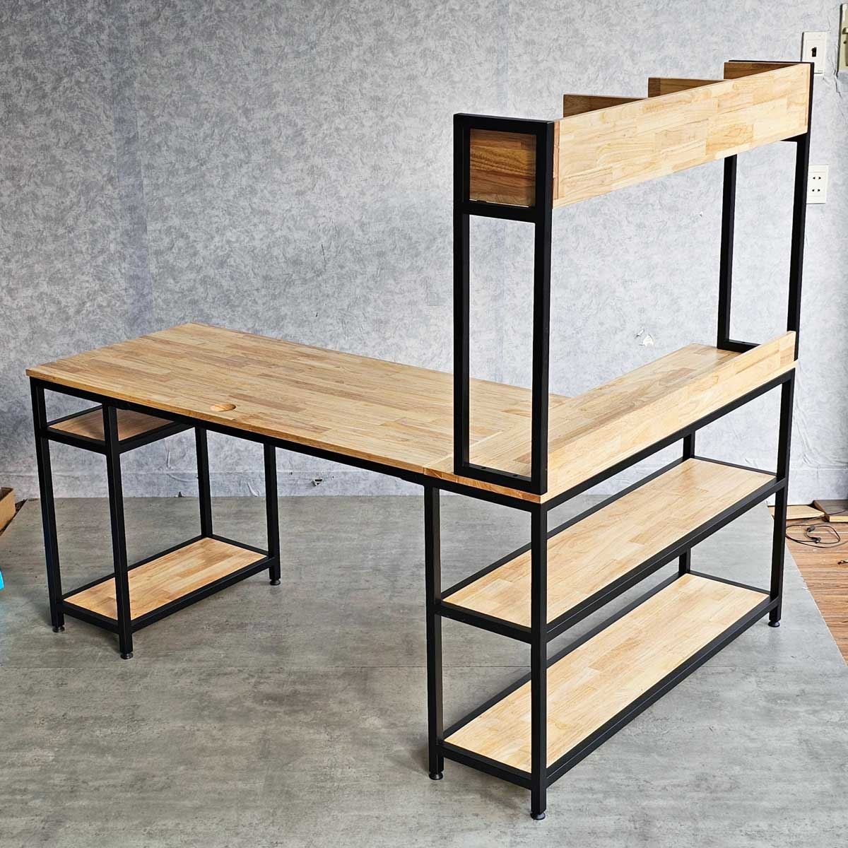 Phần kệ được bố trí bên hông bàn, gồm nhiều ngăn với kích thước đa dạng, giúp bạn sắp xếp sách vở, tài liệu và vật dụng học tập một cách gọn gàng, khoa học. Với thiết kế kệ mở giúp bạn dễ dàng lấy và cất giữ đồ đạc khi cần thiết. Mặt bàn chính là tấm gỗ nguyên tấm có kích thước rộng rãi, tạo điều kiện thuận lợi cho bạn đặt laptop, máy tính, sách vở và các dụng cụ học tập khác. Bạn có thể thoải mái học tập, sáng tạo mà không lo thiếu không gian. Phần khung chân bàn được thiết kế đặc biệt với ngăn chứa rộng rãi, giúp bạn cất giữ thùng PC một cách gọn gàng, tiết kiệm diện tích.