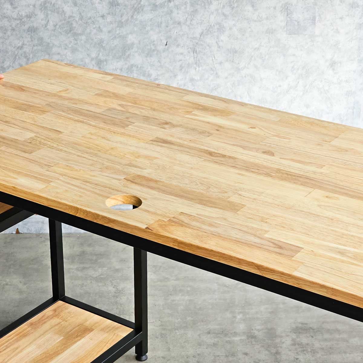 Chất liệu được làm băng gỗ cao su AA, tiêu chuẩn xuất khẩu, được xử lý chàm nhám kỹ lưỡng, bề mặt xử lý chống thấm nước, giúp tăng độ bền và đảm bảo tính thẩm mỹ cao. Vân gỗ cao su AA không chỉ mang đến vẻ đẹp sang trọng, ấm áp mà còn đảm bảo độ bền chắc theo thời gian. Khung sắt của bàn làm việc được làm từ chất liệu sắt dày dặn, sơn tĩnh điện chống gỉ sét và trầy xước. Nhờ đó, bàn có khả năng chịu lực tốt, đảm bảo an toàn cho người sử dụng.