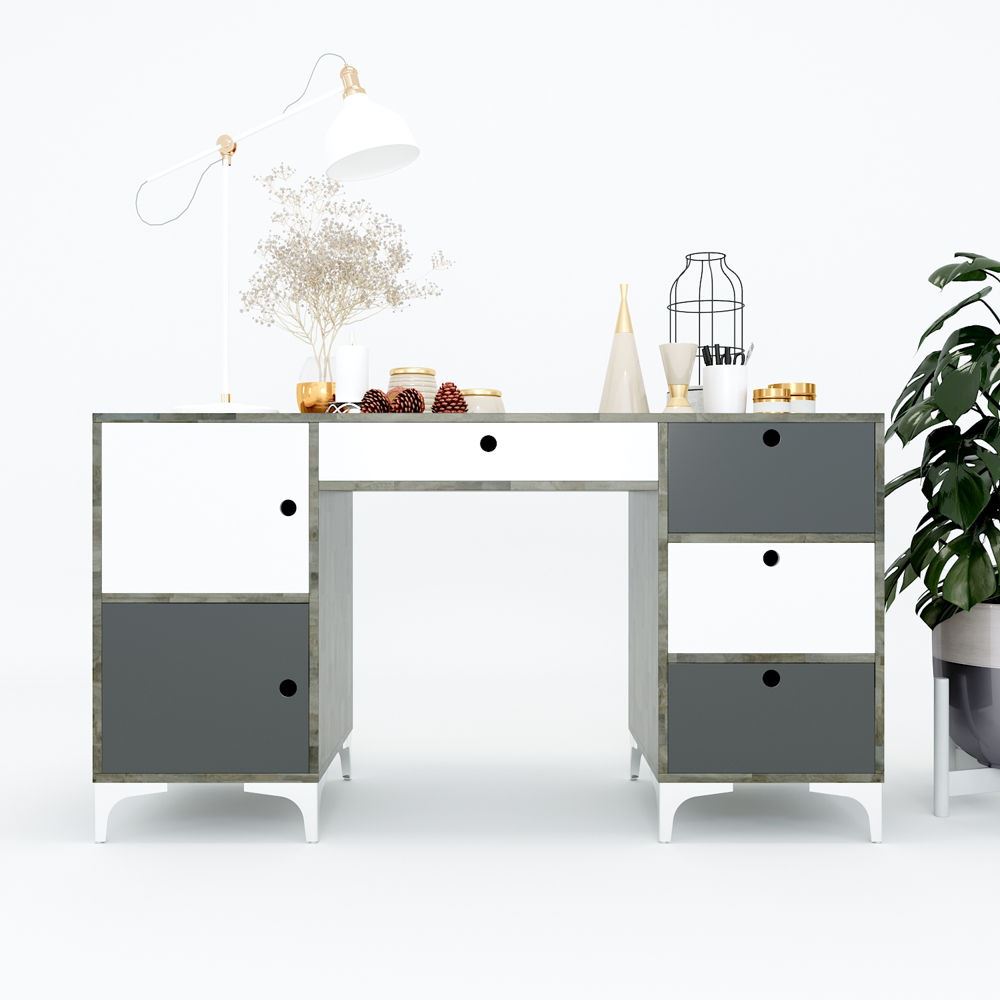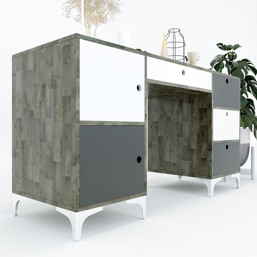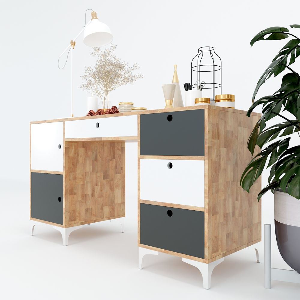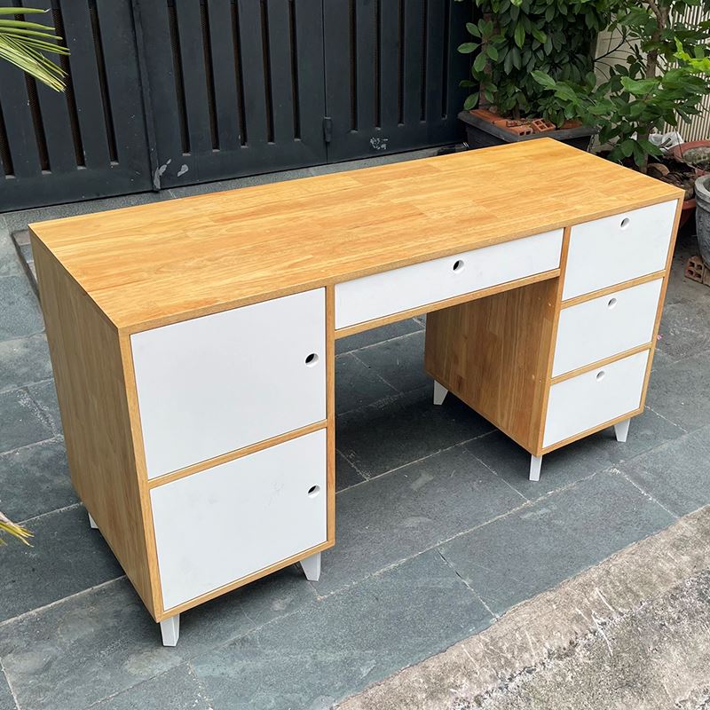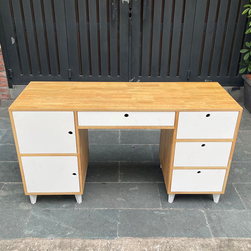 Bàn học chân tủ có hộc kéo (140x50x75cm) BD68047 thiết kế đẹp mắt với hộc kéo và tủ mở ở hai chân hai bên, hai chân tủ hai bên với kích thước rộng 40cm còn lại khoảng trống ngồi 80cm giúp để ghế thoải mái, một bên hệ cửa mở và một bên hệ ngăn kéo cùng ngăn kéo ở giữa phối màu với lỗ kéo đơn giản nhưng tiện lợi. Bàn với chất liệu gỗ cao su tiêu chuản AA dày 17mm sơn pU hoàn thiện màu sắc đẹp mắt.