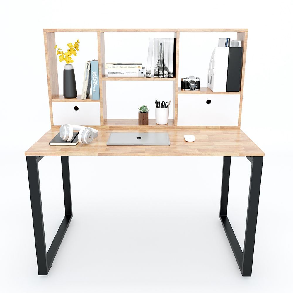 Bàn học chân sắt gỗ cao su màu tự nhiên ( 70x120x135cm) FD68016 với mặt bàn và kệ được làm từ gỗ cao su tiêu chuẩn AA dày 17mm sơn PU màu tự nhiên cực đẹp, hệ kệ có hộc kéo hai bên tiện lợi cùng với đó là hệ chân sắt lắp ráp sơn tĩnh điện chắc chắn