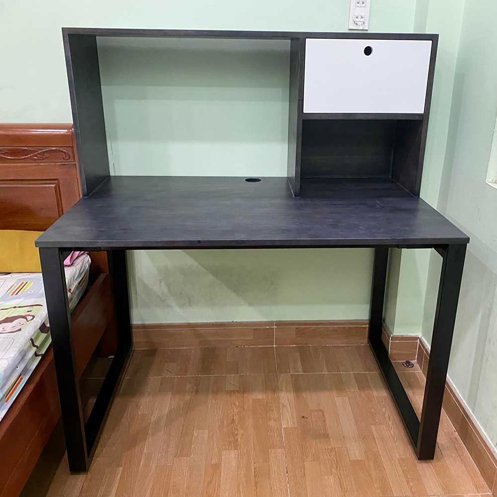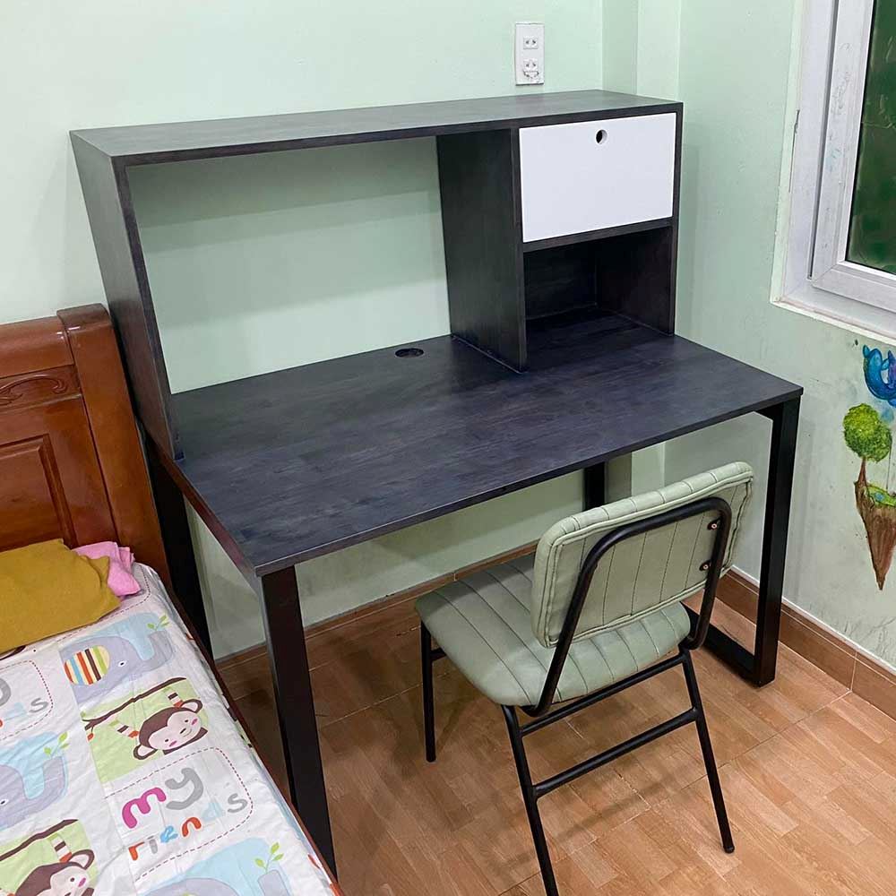 Kích thước mặt bàn 70x120cm đủ lớn để kết hợp với hệ kệ kích thước sâu 30cm còn lại không gian bàn sử dụng 50cm khá rộng rãi để làm việc với laptop hay sách vở, mẫu bàn rất phù hợp cho mọi không gian gia đình sử dụn làm bàn học, bàn làm việc đều được. Hộc bên trái với chiều cao 50cm các bạn có thể để kết hợp với màn hình máy tính bàn đều được