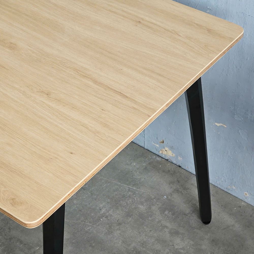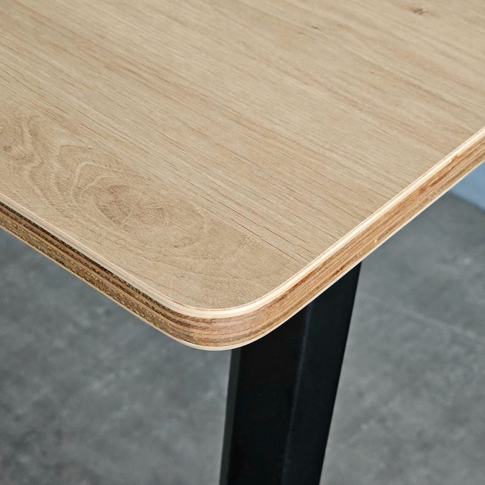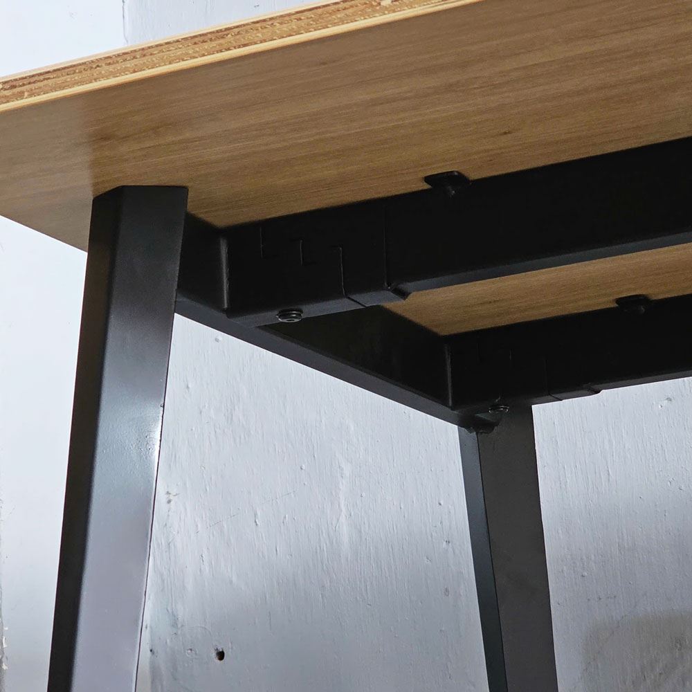 Với mặt bàn được làm bằng gỗ plywood, có cấu trúc từ những tấm ván ép lại với nhau tạo ra một cấu trúc khá vững chắc. Sự xen kẽ giữa các lớp gỗ và việc sử dụng keo chịu nước để liên kết chúng làm tăng tính cứng của vật liệu. Điều này cho phép gỗ plywood chịu được sức ép và trọng lượng lớn hơn so với gỗ thông thường mà không bị cong vênh hay biến dạng nhiều. Hệ khung chân sắt sử dụng loại sắt dày dặn, giúp cho bàn luôn đảm bảo độ cứng cáp, ổn định và khả năng chịu lực tốt. Bề mặt khung chân sắt được phủ một lớp sơn tĩnh điện bảo vệ giúp chống ăn mòn, tăng tuổi thọ sản phẩm và đồng thời đảm bảo tính thẩm mỹ cao.