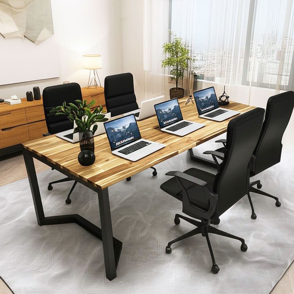 Mặt bàn họp được làm từ gỗ tràm dày dặn, cứng cáp, có khả năng chịu tải trọng lớn