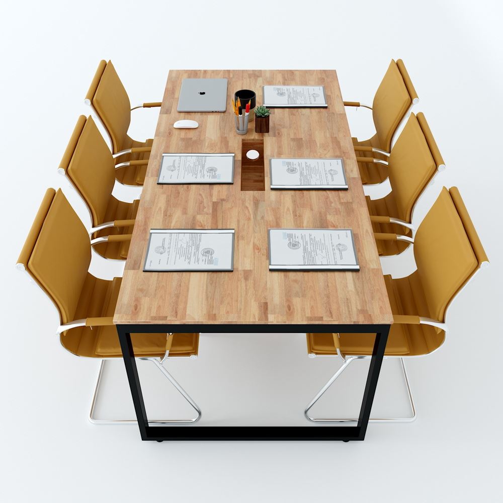 Bàn Họp HBRT008 Rectang Concept chân sắt chữ nhật 25x50. Bàn văn phòng gỗ cao su ghép tiêu chuẩn AA dày 17mm PU màu gỗ tự nhiên luôn có một vẻ đẹp riêng, thân thiện với môi trường, đối với các văn phòng mở, văn phòng kết hợp với cây xanh thì việc sử dụng bàn gỗ cao su chân sắt kết hợp trở nên hoàn hảo. Chất liệu gỗ cao su tại HomeOffice là gỗ ghép dày 17mm tiêu chuẩn AA ( 2 mặt đẹp) được xử lý qua 4 công đoạn trước khi PU hoàn thiện cho bề mặt sản phẩm rất đẹp mắt, chống nước tuyệt đối. Khung chân sắt sơn tĩnh điện với cơ cấu ngàm lắp ráp dễ dàng.