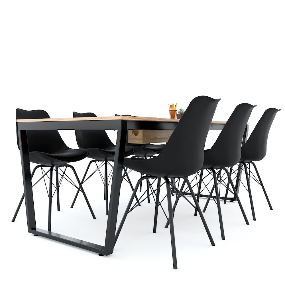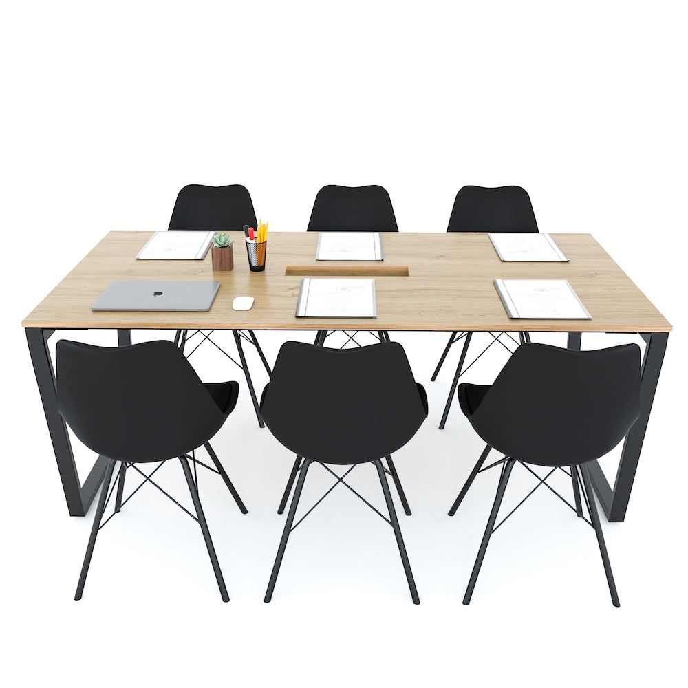 Bàn họp 180x90cm chân sắt lắp ráp hệ Trapeze HBTC042 với mặt bàn gỗ Plywood cốt gỗ tự nhiên bề mặt phủ melamin vân sồi đẹp mắt, bề mặt bàn được xử lý chống thấm nước và cong vênh, màu gỗ tự nhiên đẹp mắt mang đến sự thân thiện, gần gũi cho không gian làm việc của bạn. Kết hợp với mặt bàn Plywood là hệ khung chân sắt theo cơ cấu lắp ráp ngàm thông minh, tiện lợi nhưng vẫn đảm bảo độ chắc chắn, bên cạnh đó bề mặt chân sắt được phủ lớp sơn tĩnh điện cao cấp làm hạn chế ăn mòn hoá học giúp sản phẩm có độ bền cao hơn.