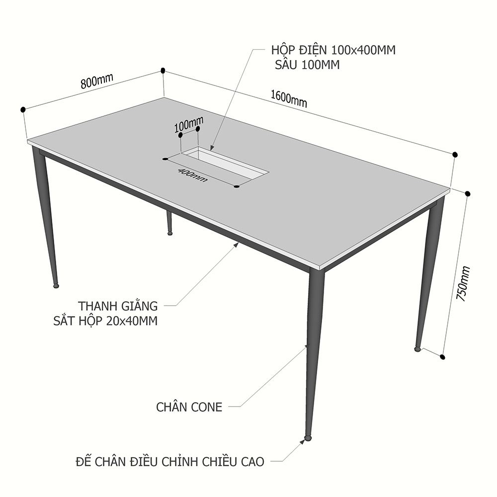 Kích thước chi tiết bàn họp 160x80cm chân sắt hệ CONE II