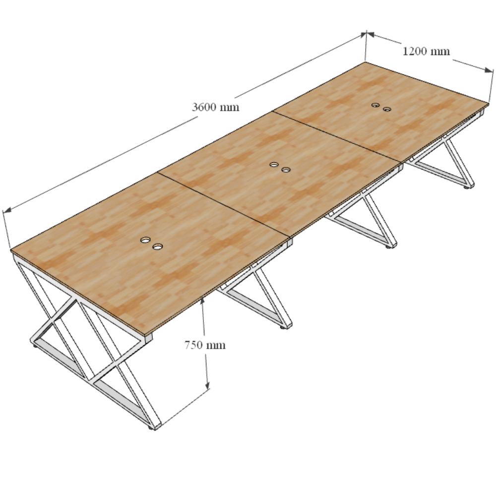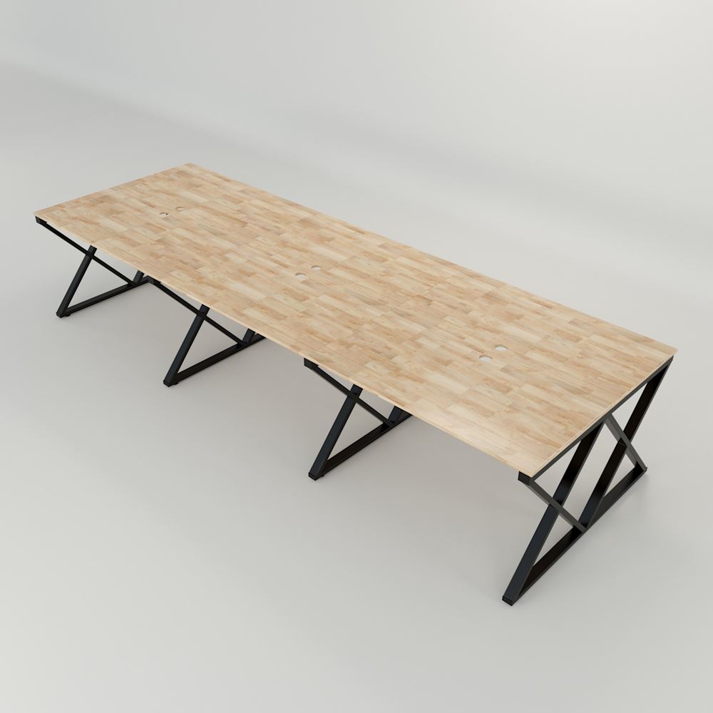 Bàn cụm 6 120x360cm gỗ cao su XConcept HBXC009 chân sắt chữ nhật 25x50. Bàn văn phòng gỗ cao su ghép tiêu chuẩn AA dày 17mm PU màu gỗ tự nhiên luôn có một vẻ đẹp riêng, thân thiện với môi trường, đối với các văn phòng mở, văn phòng kết hợp với cây xanh thì việc sử dụng bàn gỗ cao su chân sắt kết hợp trở nên hoàn hảo. Chất liệu gỗ cao su tại HomeOffice là gỗ ghép dày 17mm tiêu chuẩn AA ( 2 mặt đẹp) được xử lý qua 4 công đoạn trước khi PU hoàn thiện cho bề mặt sản phẩm rất đẹp mắt, chống nước tuyệt đối. Khung chân sắt sơn tĩnh điện với cơ cấu ngàm lắp ráp dễ dàng.