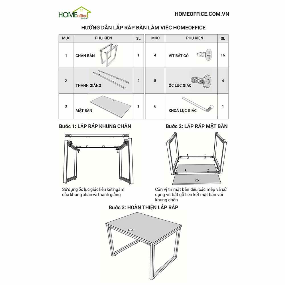 Với mong muốn mang đến dịch vụ tốt nhất cho khách hàng, bảng hướng dẫn lắp ráp bàn làm việc HomeOffice giúp bạn có thể dễ dàng hoàn thiện bàn làm việc khi mua bàn dưới hình thức phụ kiện rời. Bảng hướng dẫn gồm số lượng chi tiết các phụ kiện và các bước để lắp ráp các phụ kiện lại với nhau thành bàn hoàn thiện một cách nhanh chóng và tiện lợi nhất.