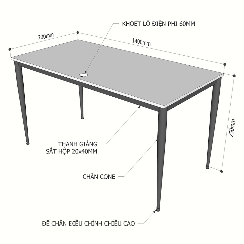 Bàn làm việc 140x70cm gỗ Plywood phủ melamin chân hệ Cone II