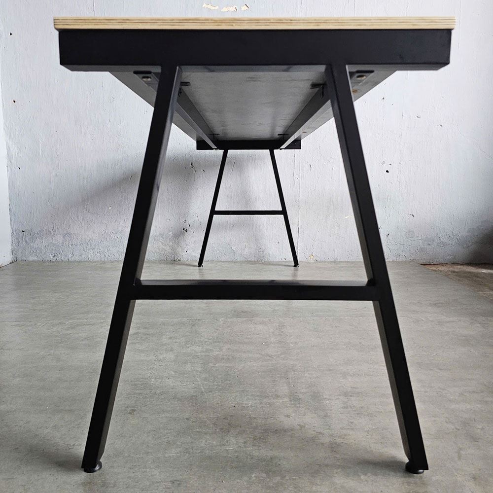 Bàn cụm 2 người HBAC057 gây ấn tượng mạnh mẽ với khung chân sắt tạo hình chữ A độc đáo và cá tính. Thiết kế này không chỉ mang lại vẻ đẹp hiện đại, tối giản mà còn đảm bảo sự vững chắc cho toàn bộ cấu trúc bàn. Khung chân sắt được lắp ráp bằng ngàm cứng cáp, tạo nên sự liên kết chắc chắn, ổn định, giúp bàn chịu được tải trọng lớn mà không bị rung lắc. Đặc biệt, thiết kế chữ A loại bỏ hoàn toàn chân bàn giữa, tạo nên khoảng trống rộng rãi phía dưới, tăng tính thẩm mỹ và tối ưu hóa không gian sử dụng. Người dùng có thể thoải mái duỗi chân, di chuyển mà không bị vướng víu.