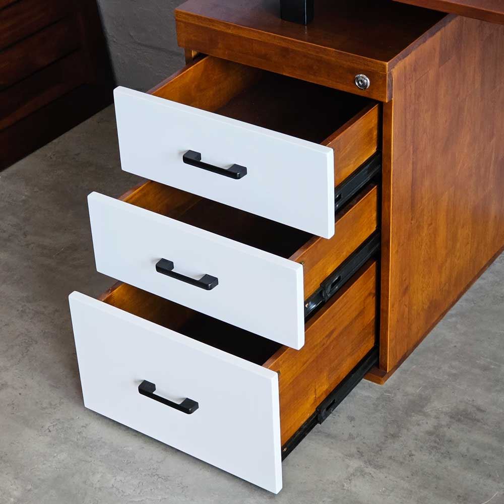 Bàn làm việc HBRT093 có kích thước rộng rãi 140x60cm, chiều cao 75cm. Mặt bàn làm việc được làm từ gỗ cao su AA chuẩn xuất khẩu, đã xử lý chống thấm, mang đến độ bền cao và thể hiện vân gỗ rõ nét. Bề mặt được xử lý nhẵn mịn giúp bạn dễ dàng vệ sinh và tạo cảm giác thoải mái khi sử dụng. Ngăn tủ có kích thước rộng rãi, giúp bạn lưu trữ nhiều tài liệu, hồ sơ và các vật dụng cá nhân một cách gọn gàng, ngăn nắp. Nhờ vậy, bạn có thể tiết kiệm diện tích và tạo sự thông thoáng cho không gian làm việc.